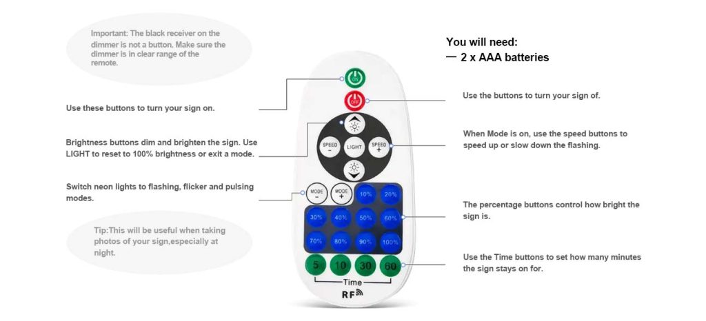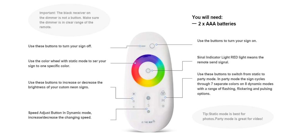 - Each Custom Neon RGB sign comes with a remote with a color wheel.