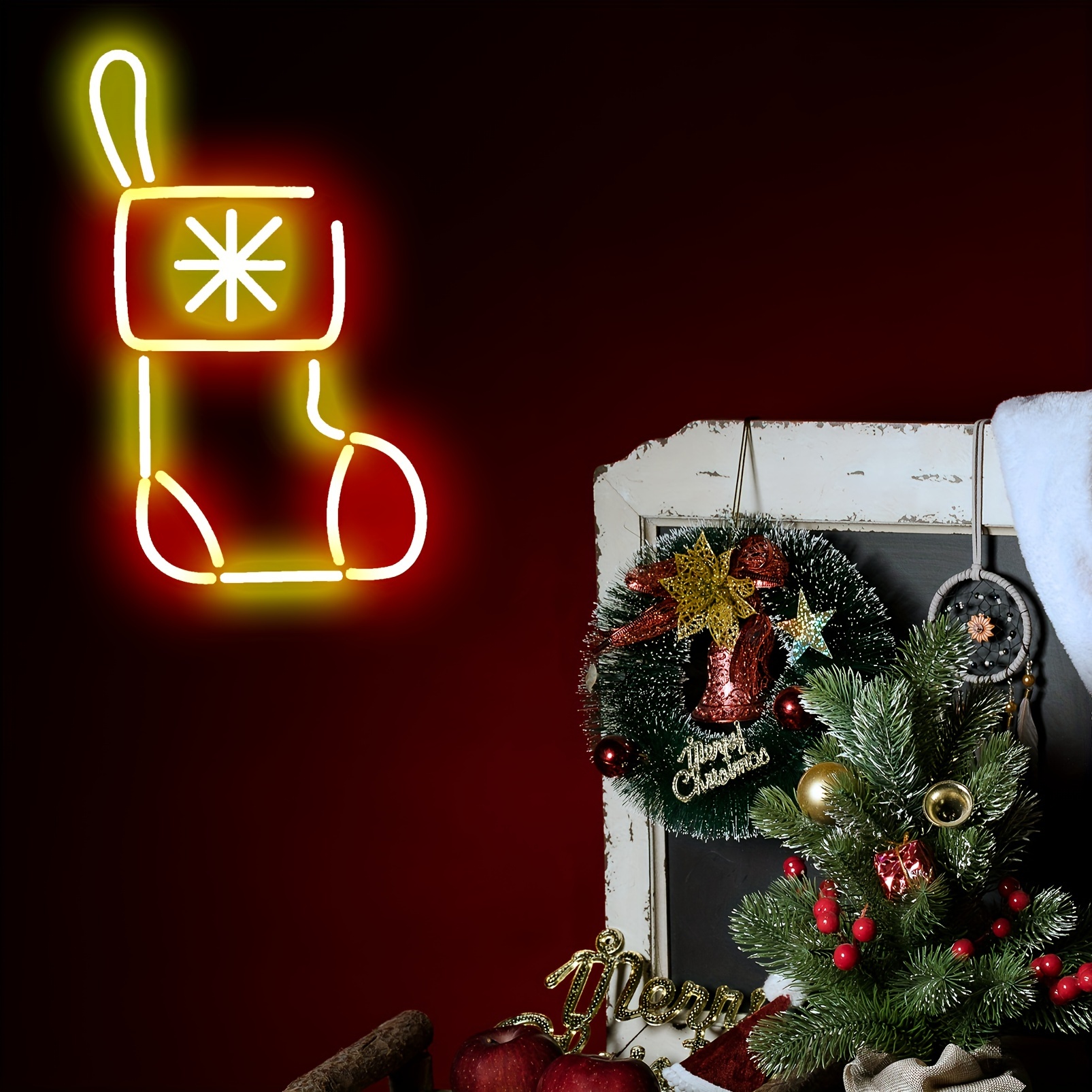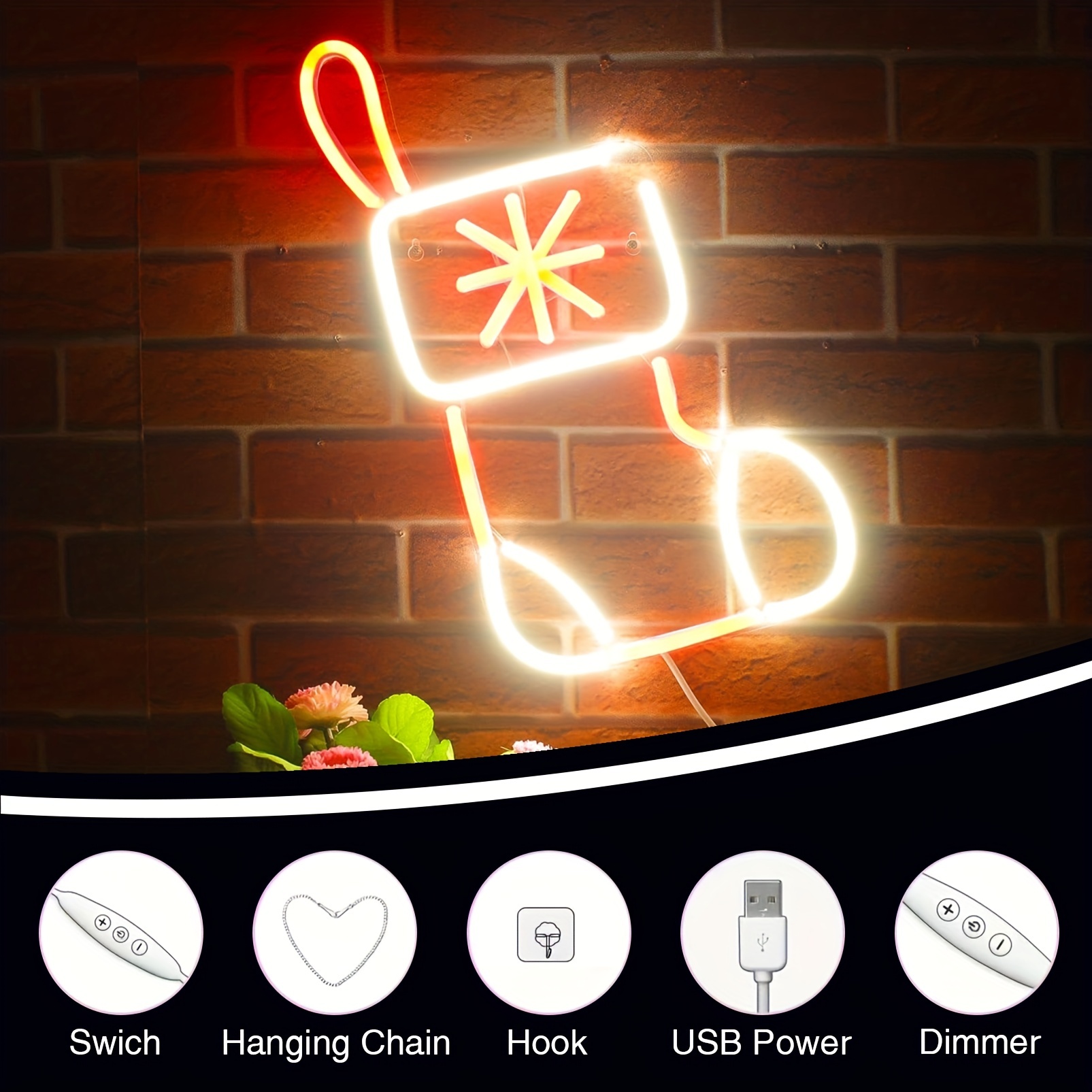 1 pc Christmas Stocking Wall Neon Decoration, Dimmable LED Christmas Ambiance Wall Decoration Neon Sign, perfect for Christmas parties, bedrooms, birthday parties, pubs, shops, games rooms, clubs, rooms, friends party wall decorations, as a friend’s family birthday, Christmas gift preferred, USB powered light up sign hanging device, 5V USB power supply