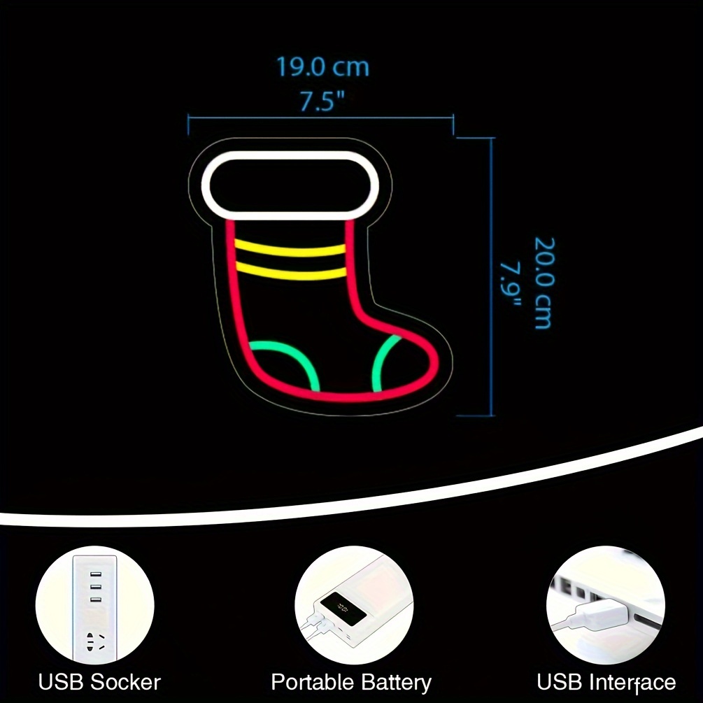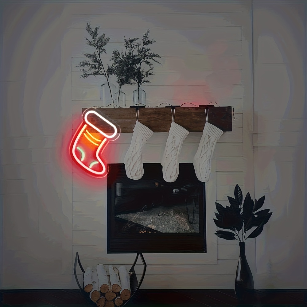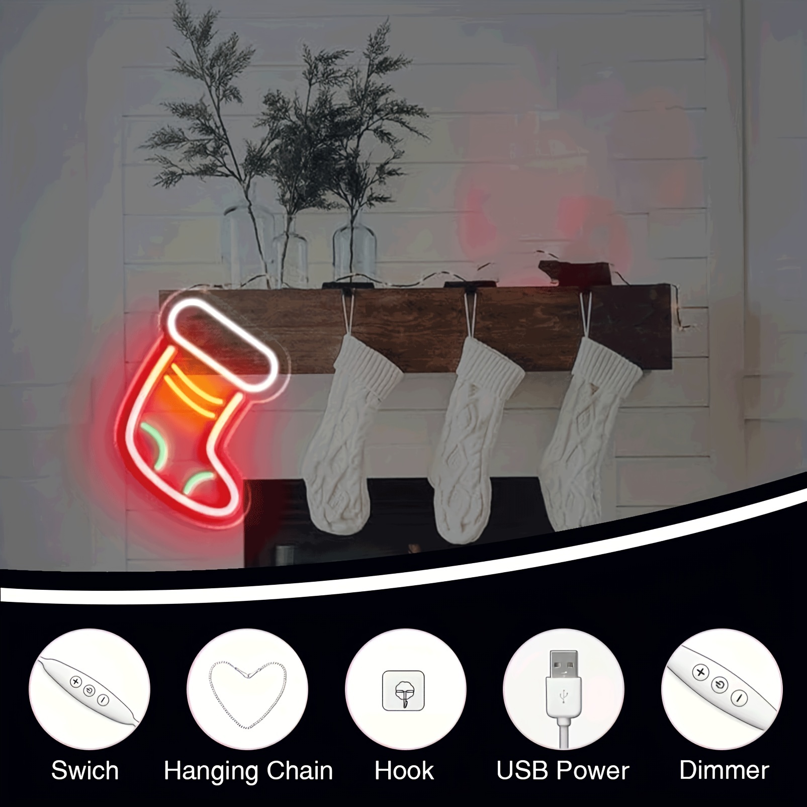 1 pc Christmas Stocking Wall Neon Decoration, Dimmable LED Christmas Ambiance Wall Decoration Neon Sign, perfect for Christmas parties, bedrooms, birthday parties, pubs, shops, games rooms, clubs, rooms, friends party wall decorations, as a friend’s family birthday, Christmas gift preferred, USB powered light up sign hanging device, 5V USB power supply