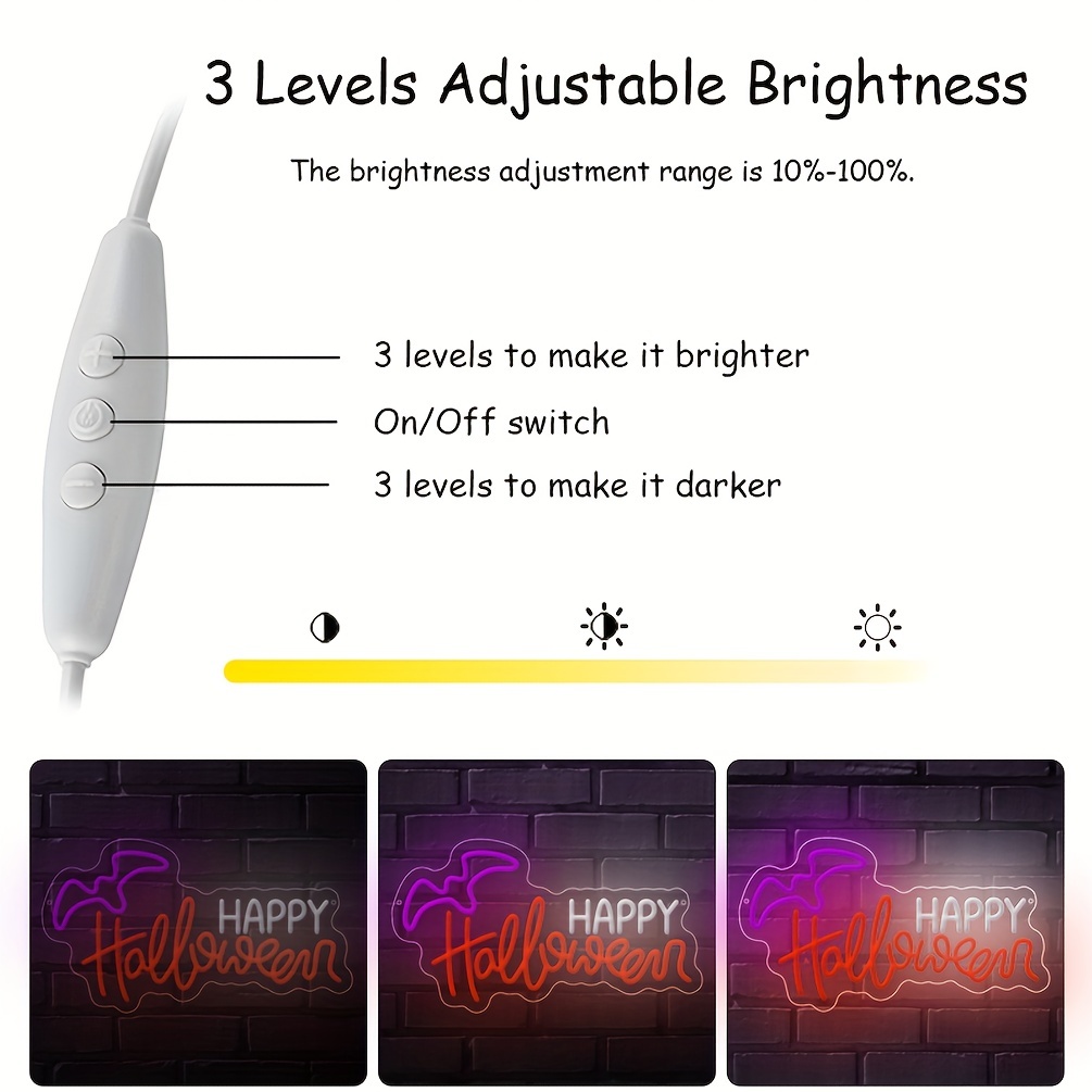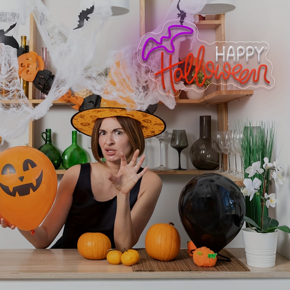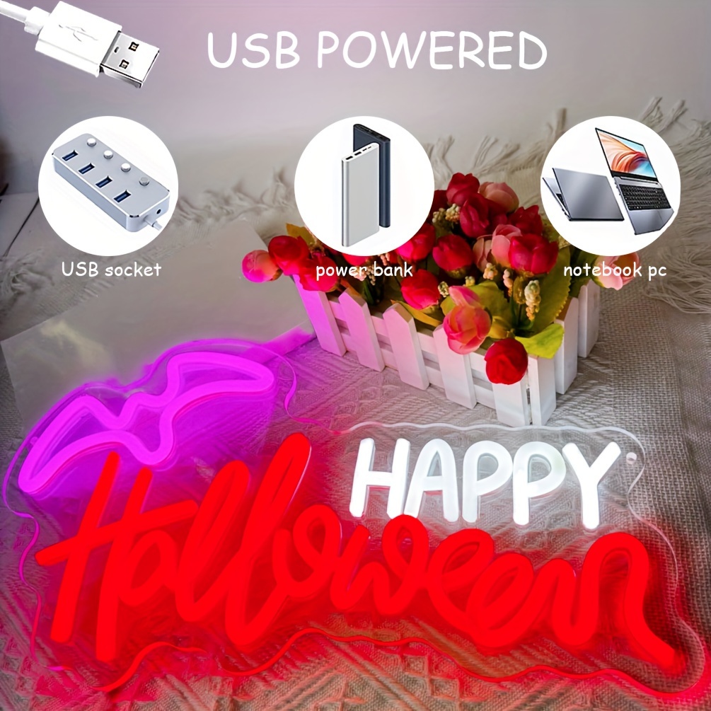 1 pc Happy Halloween with Bat Pattern Halloween Wall Neon Decoration, Dimmable LED Halloween Ambiance Wall Decoration Neon Sign, Perfect for Halloween Party, Bedroom, Birthday Party, Bar, Shop, Game Room, Club, Room, Friends Gathering Wall Decorations, as a first choice for friends and family’s birthday and Halloween gifts, USB Powered Light Up Sign Hanging Unit. 5V USB power supply