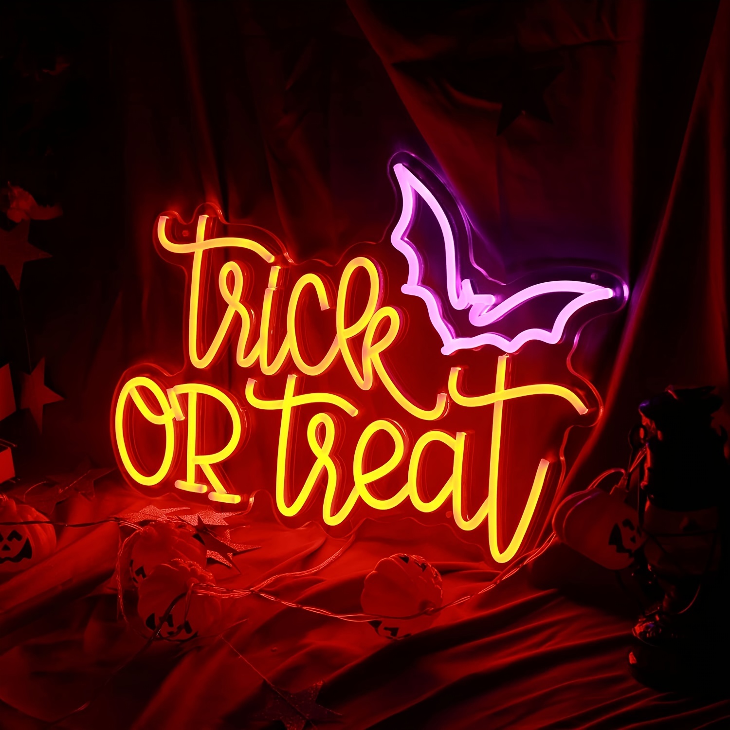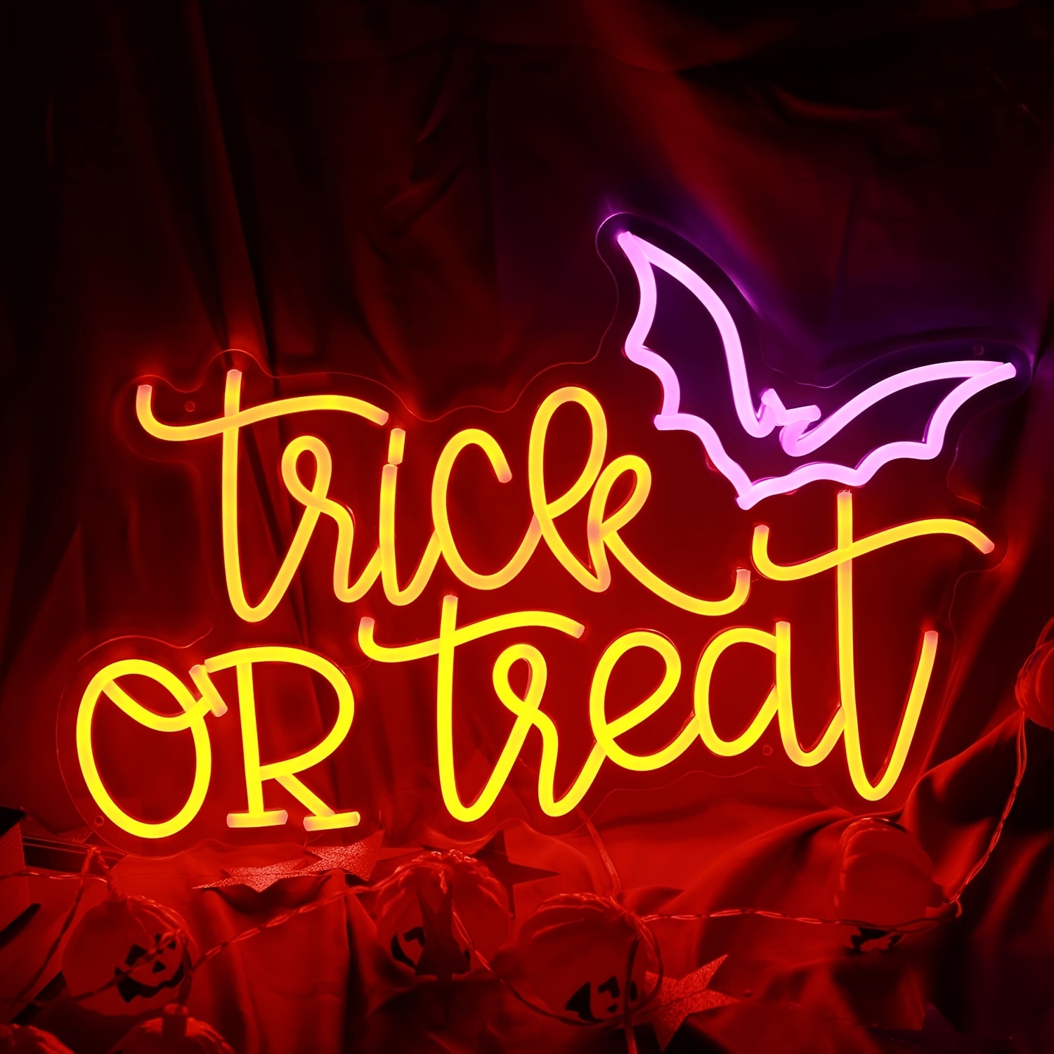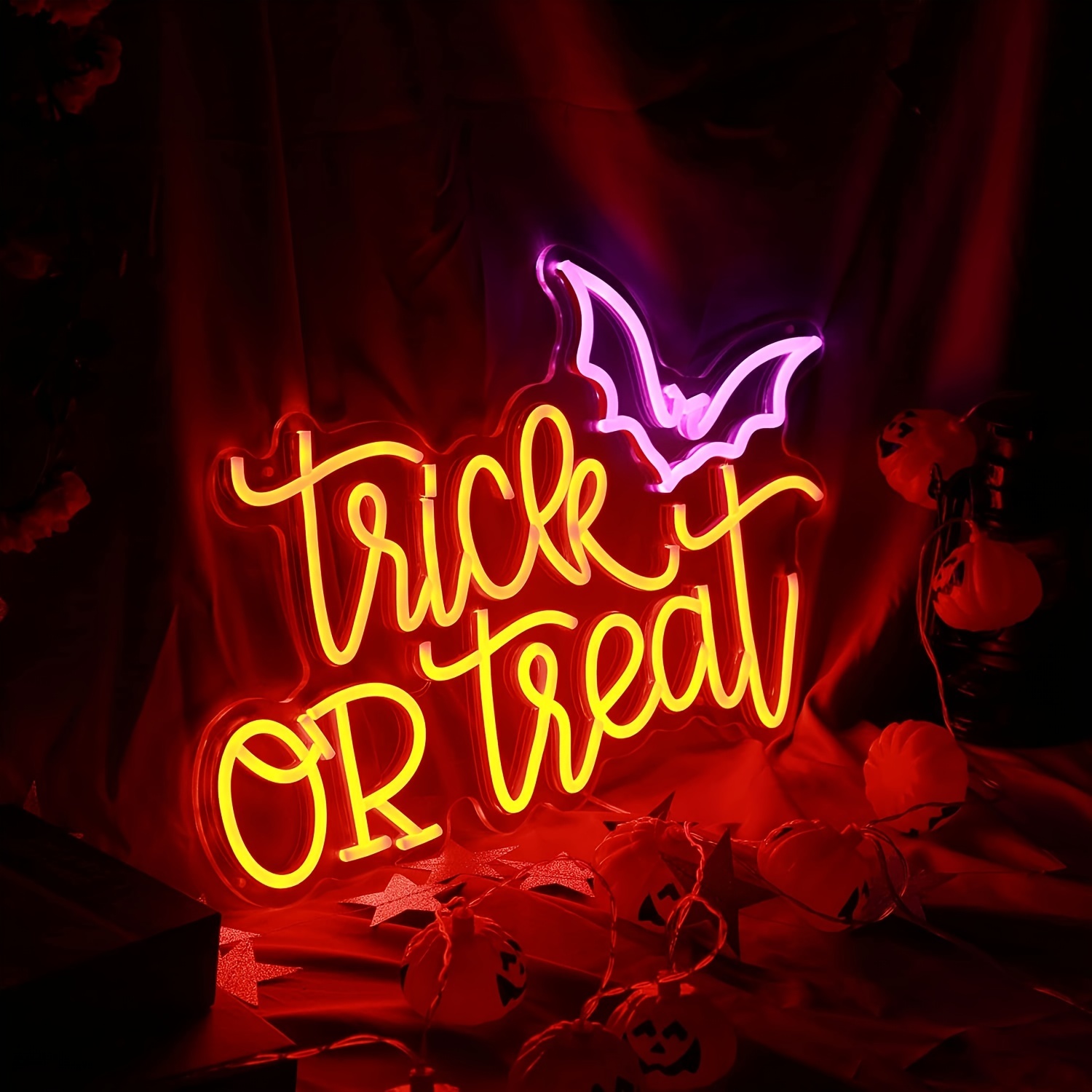 1 pc Trick or Treat Halloween Wall Neon Decoration, Dimmable LED Halloween Ambiance Wall Decoration Neon Sign, great for Halloween parties, bedrooms, birthday parties, pubs, shops, rooms, friends party wall decorations, as a friend’s family birthday, Halloween gift preferred, USB powered light up sign hanging device, 5V USB power supply