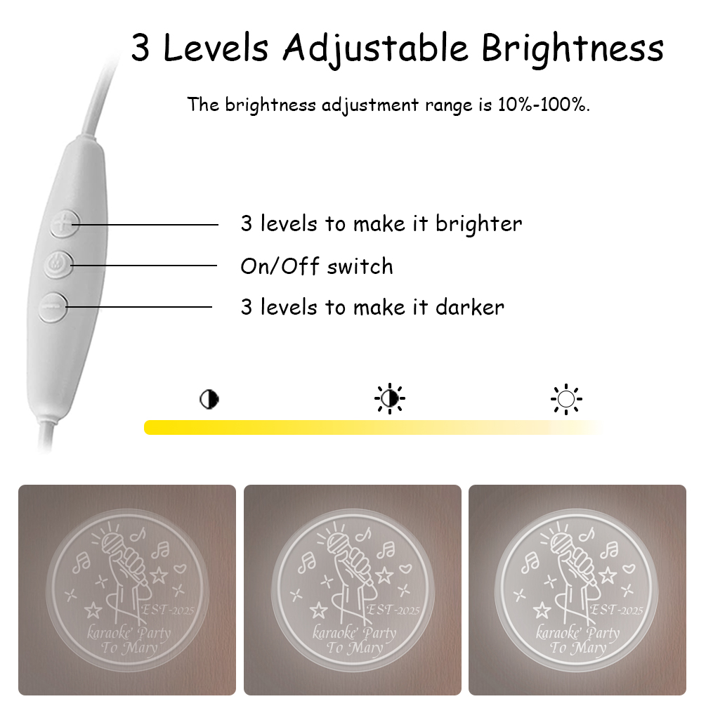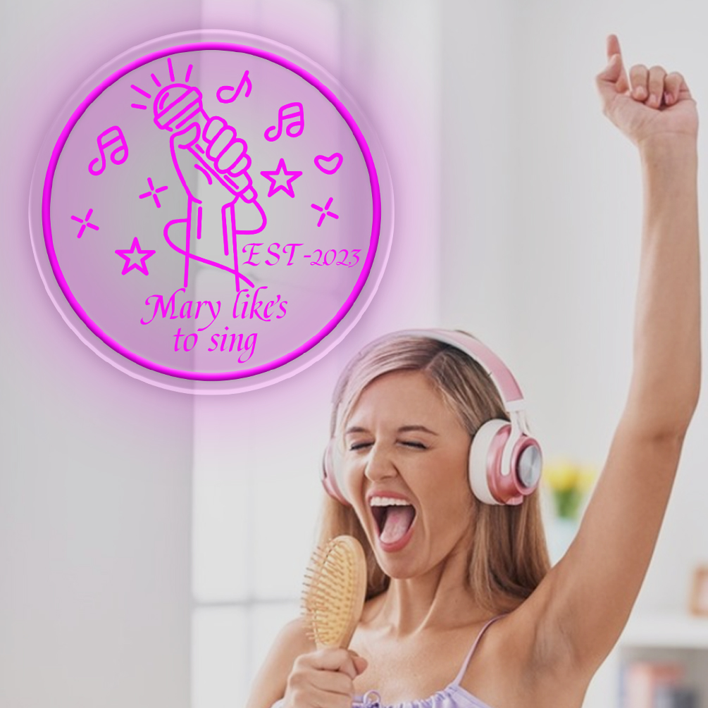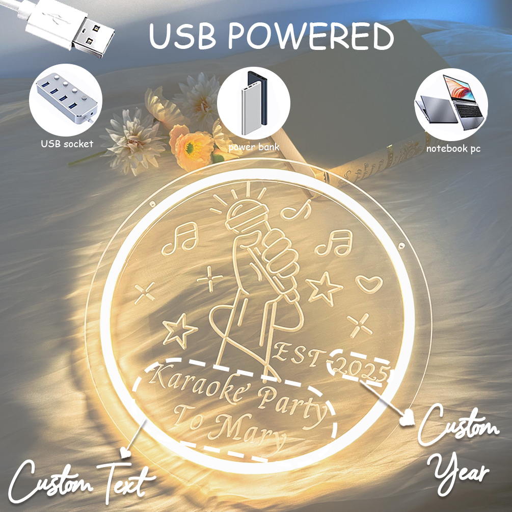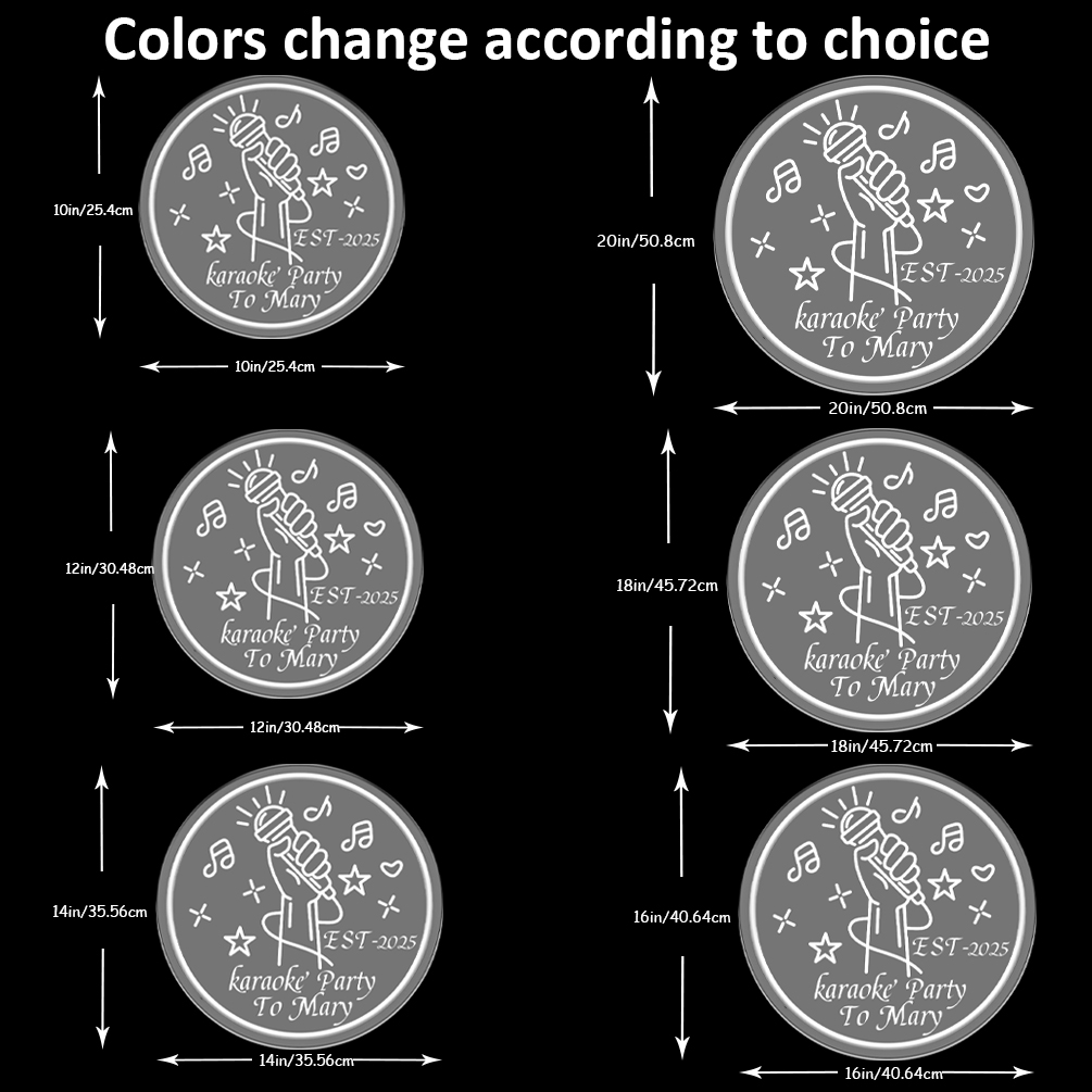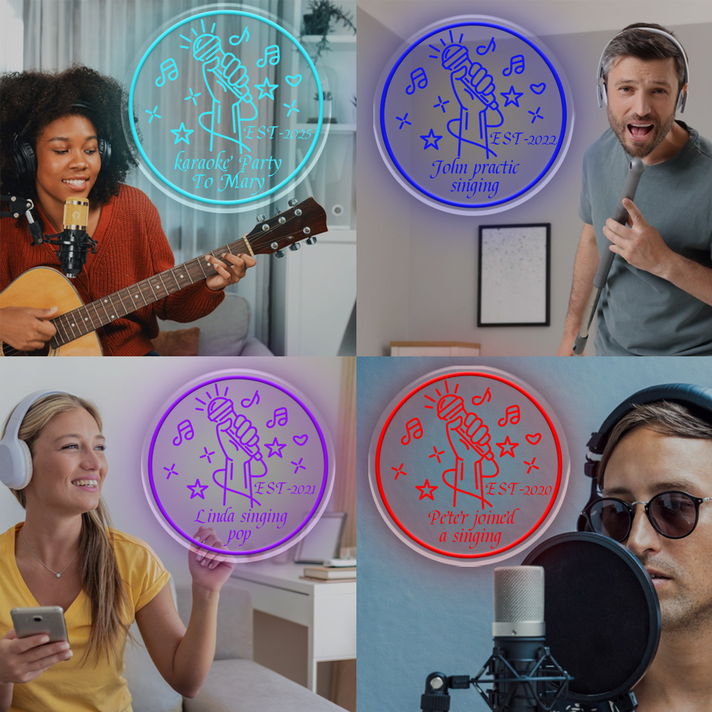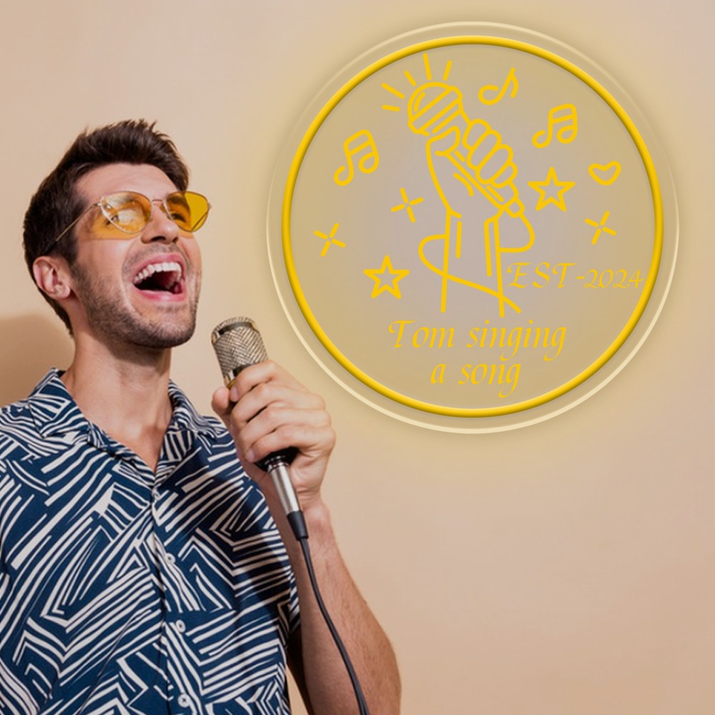 Customised circular neon sign featuring karaoke name and year, 3D engraved, personalised LED neon lighting. Ideal for karaoke parties, bars, games rooms, man caves, clubs, shops, and home décor. Makes a unique gift for clubs, housewarmings, and other occasions.