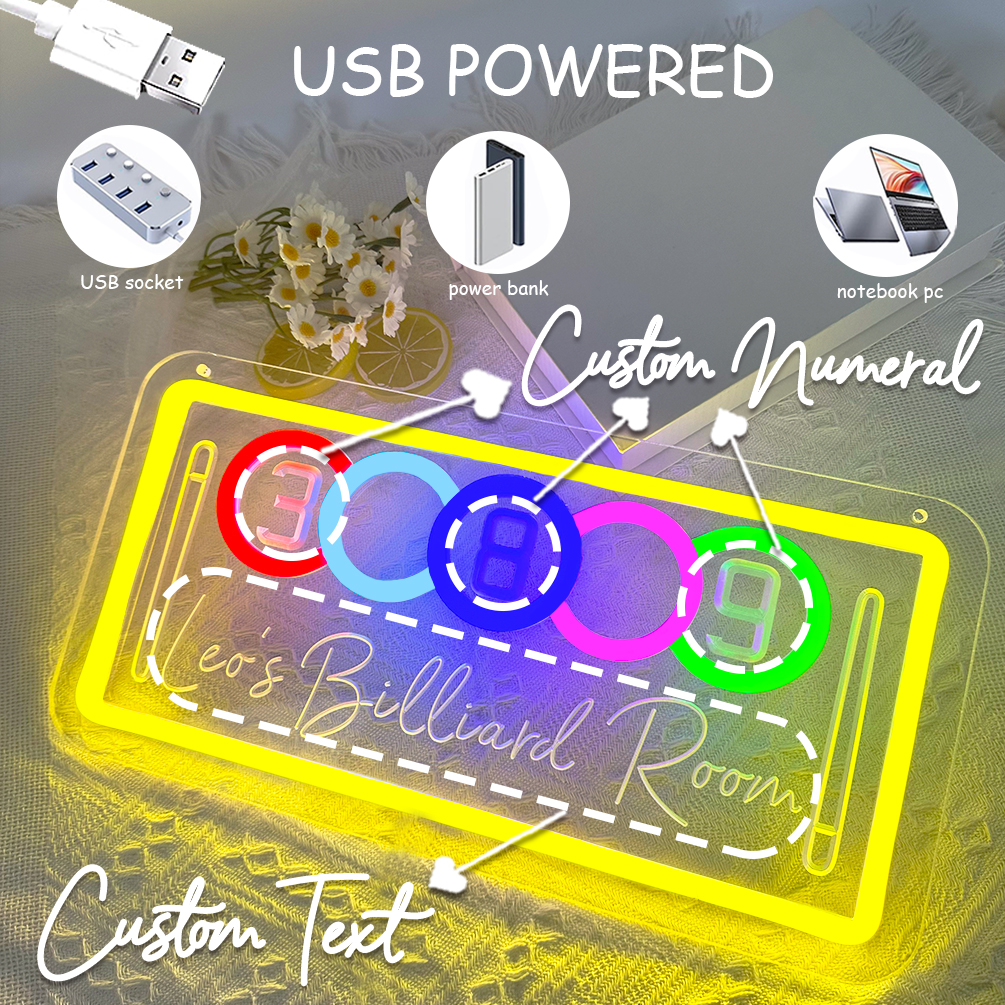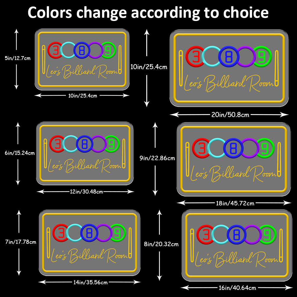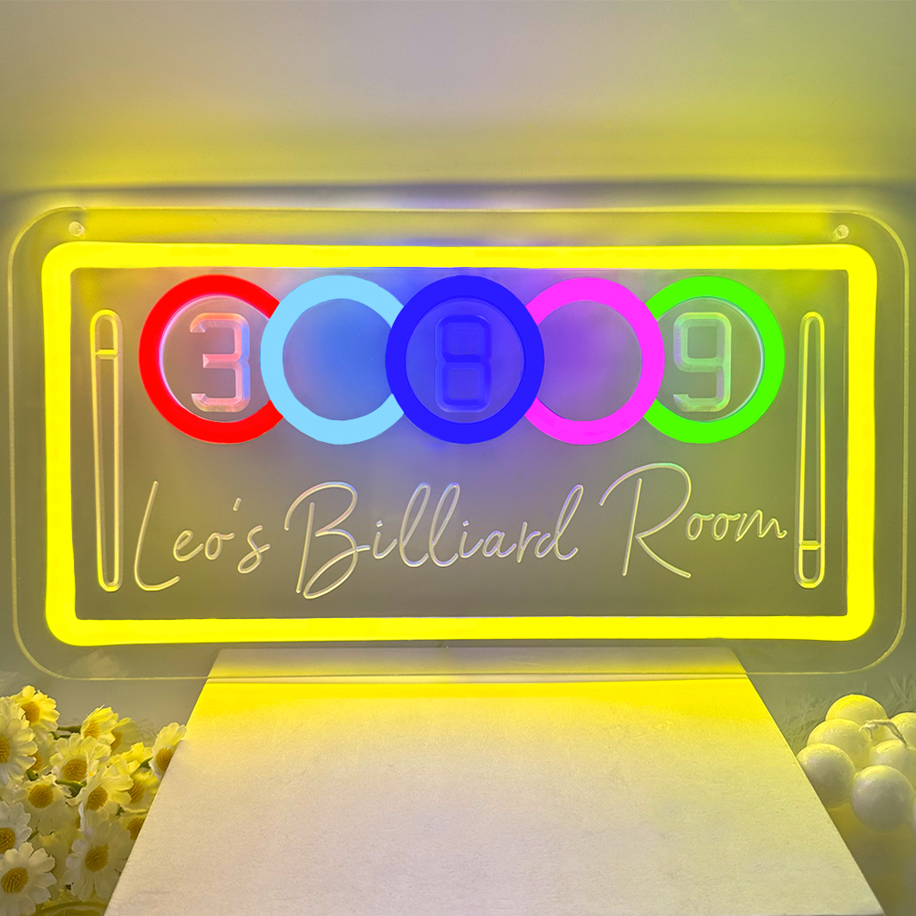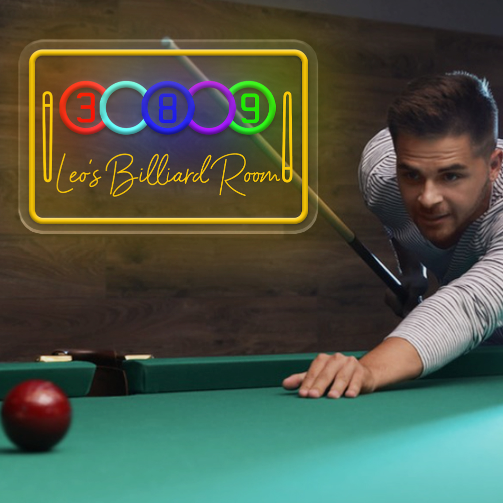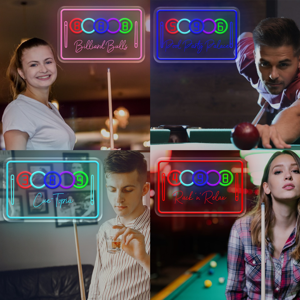 Customised neon signs featuring billiards numbers and names, with 3D engraving and personalised LED neon lighting. Perfect for birthdays, games rooms, parties, bars, billiards clubs, and home décor. An ideal, unique gift for billiards enthusiasts, clubs, housewarming celebrations, and more!