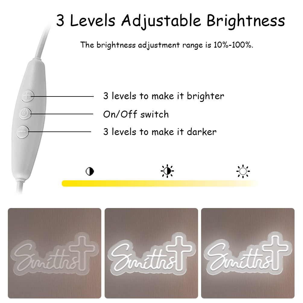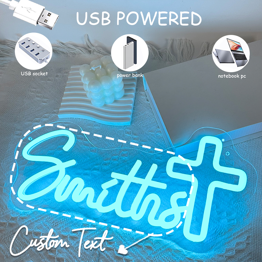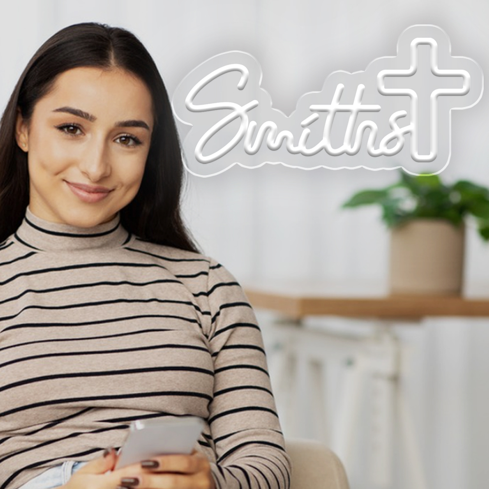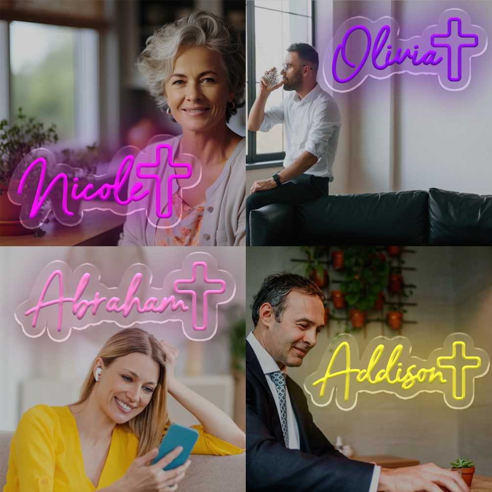Customised neon signs featuring crosses and names, personalised LED neon lighting perfect for christening days, offices, parties, bars, living rooms and home décor. An ideal unique gift for celebrations, bedrooms, housewarmings and more!