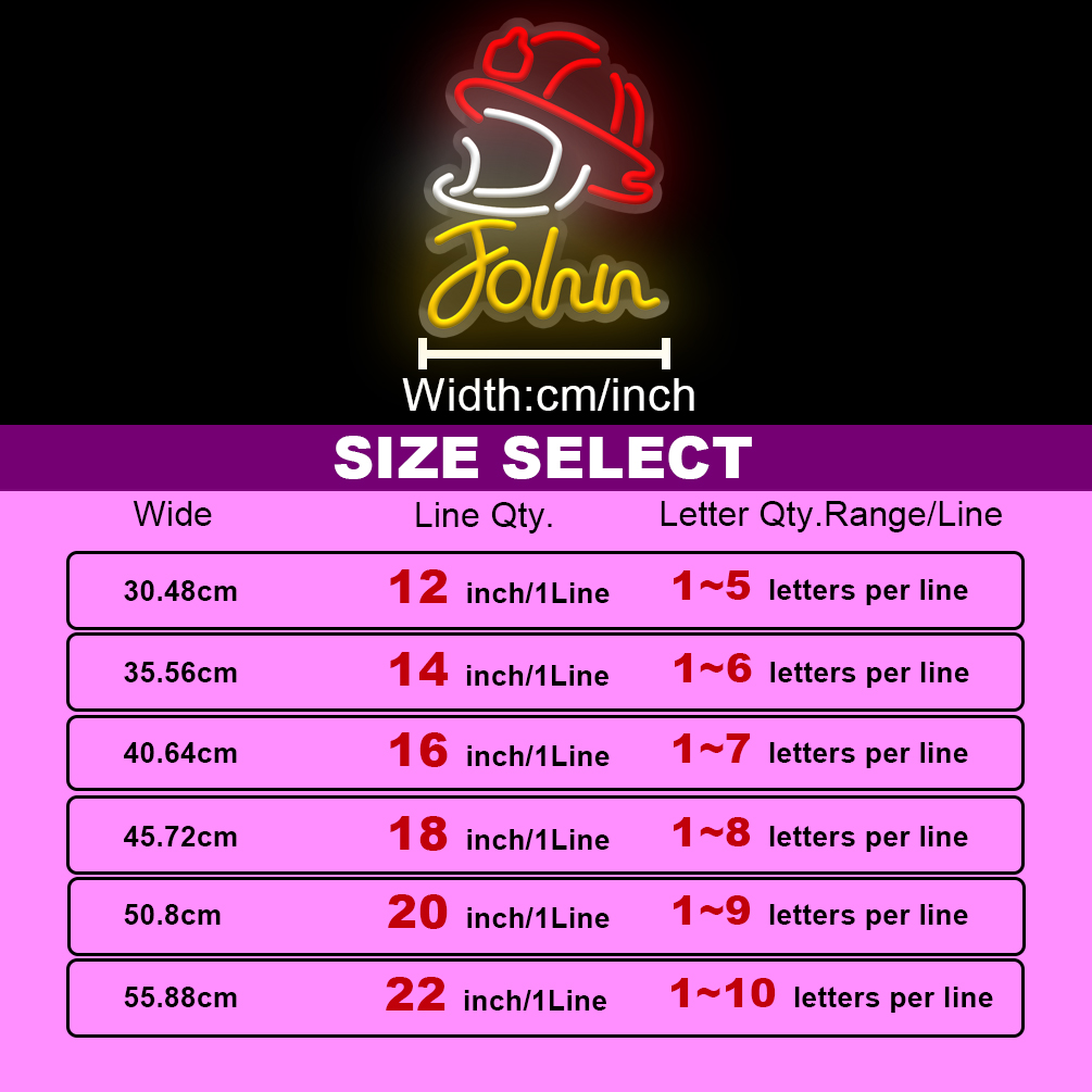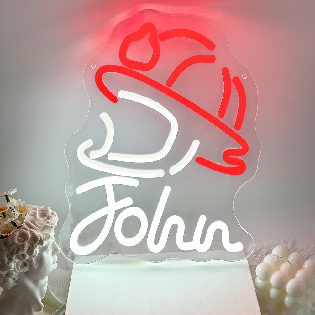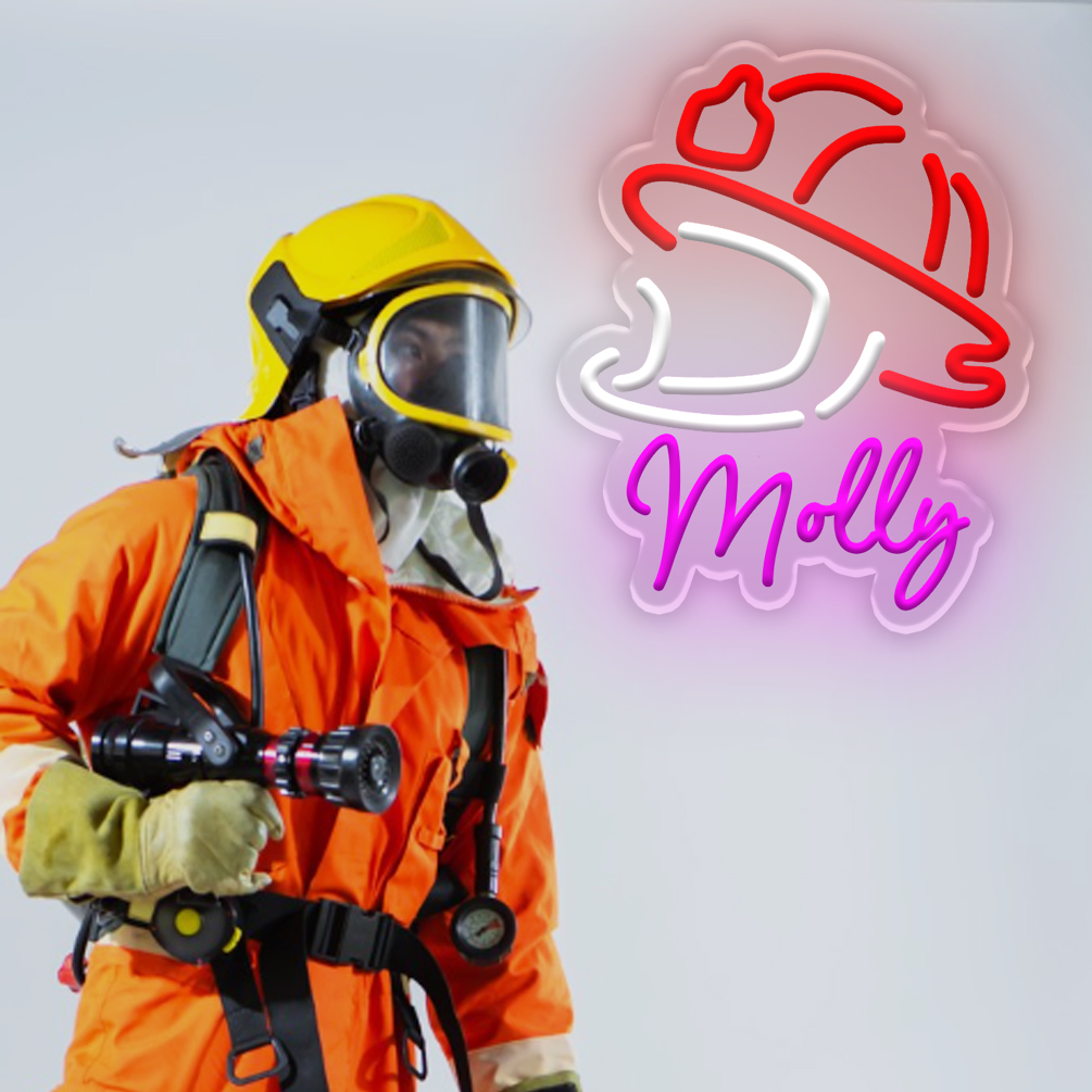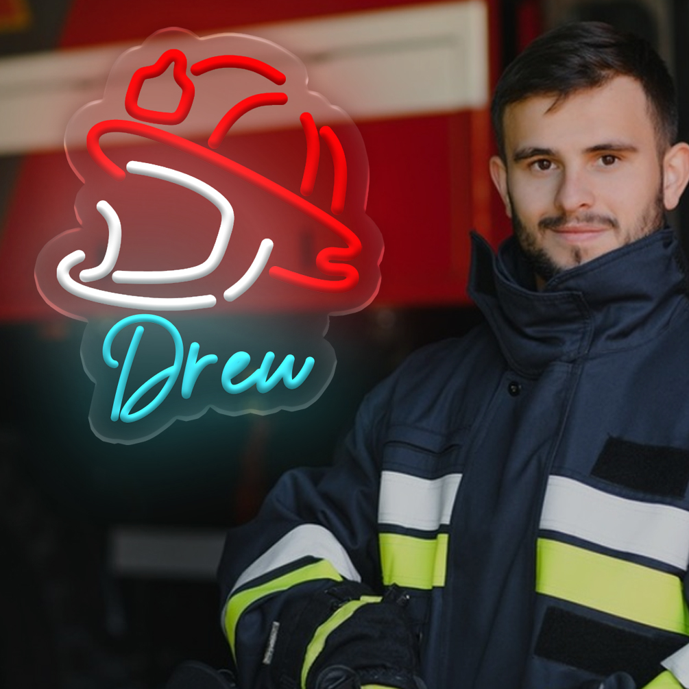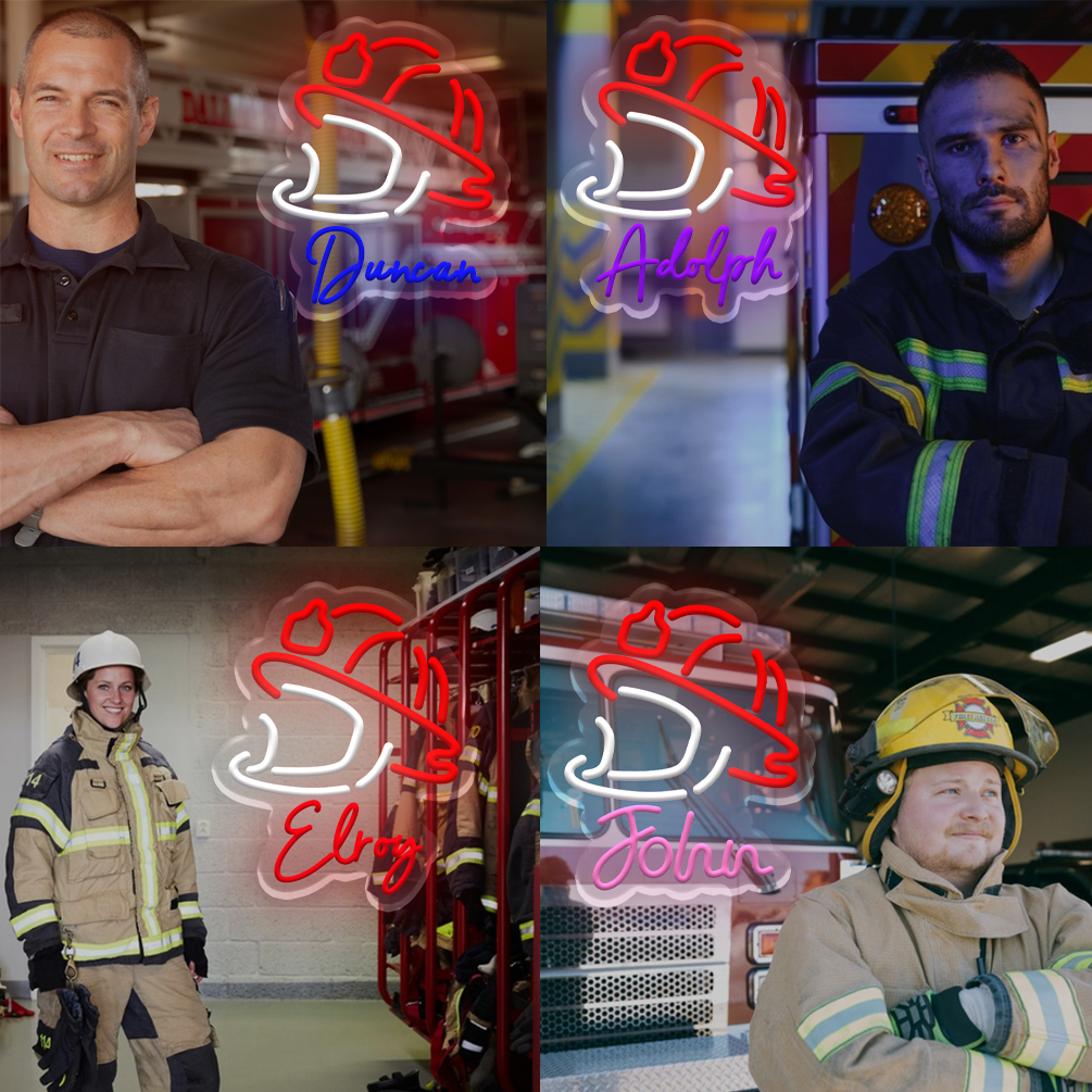 Customised neon signs featuring firefighter motifs and names, personalised LED neon lighting perfect for fire departments, firefighters, games rooms, living spaces and home décor. An ideal unique gift for firefighters, housewarming celebrations and more!