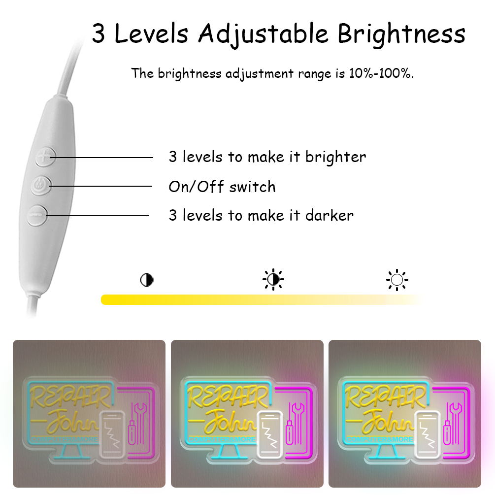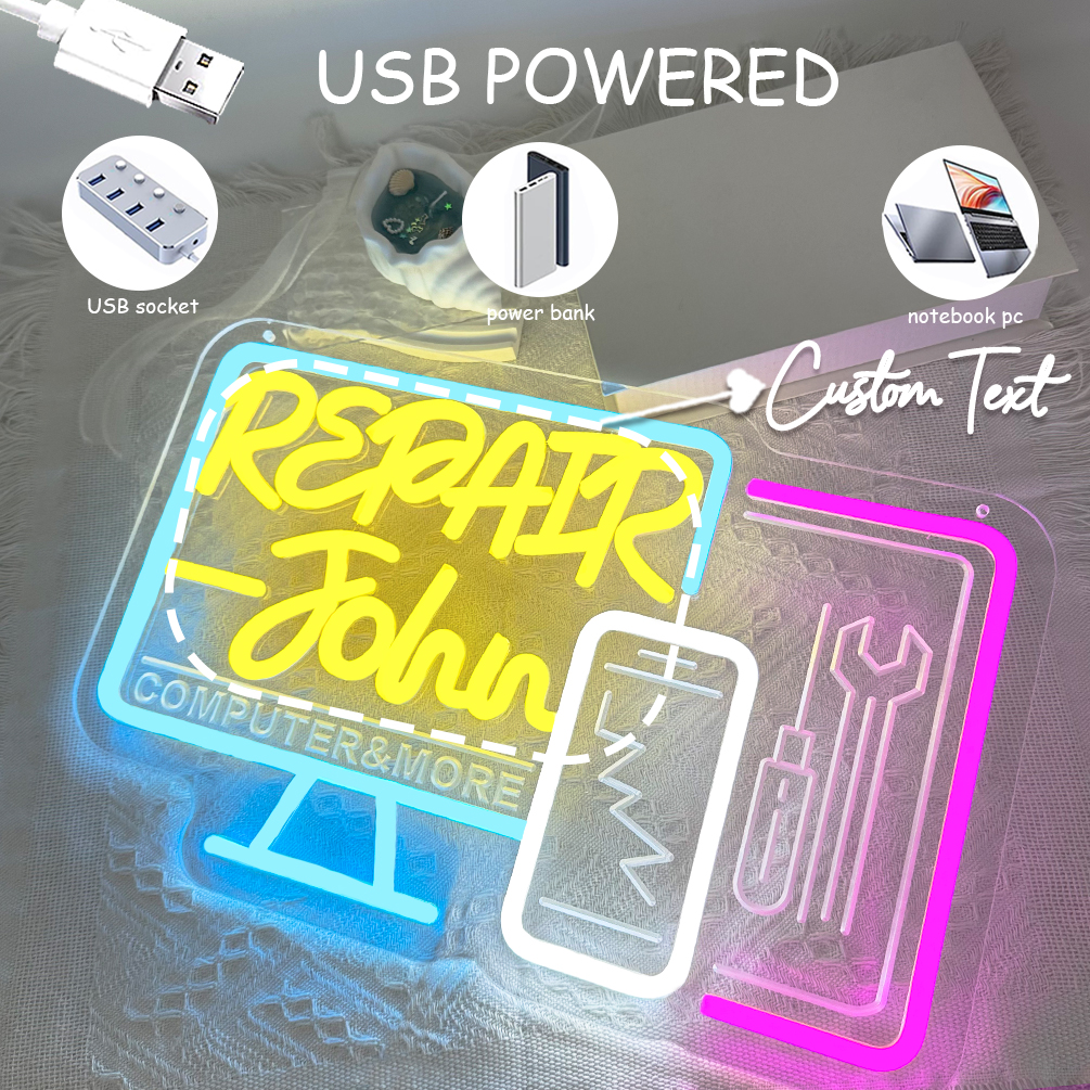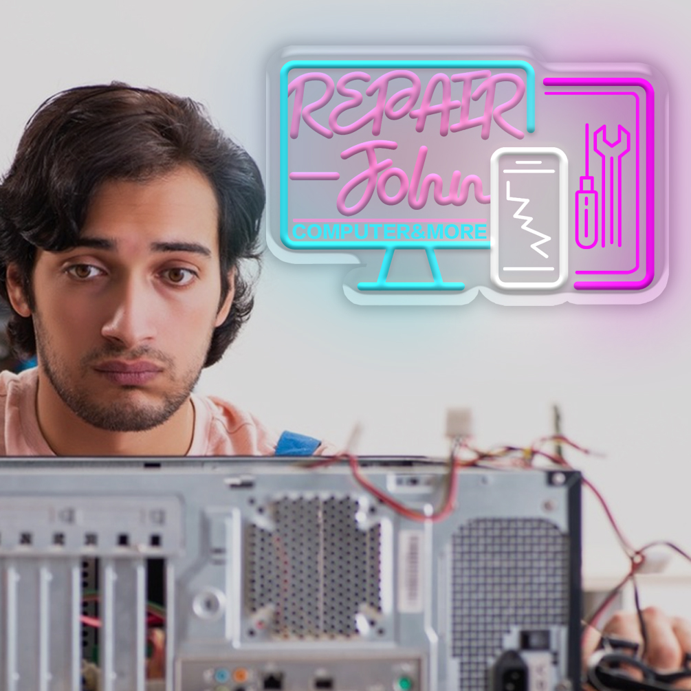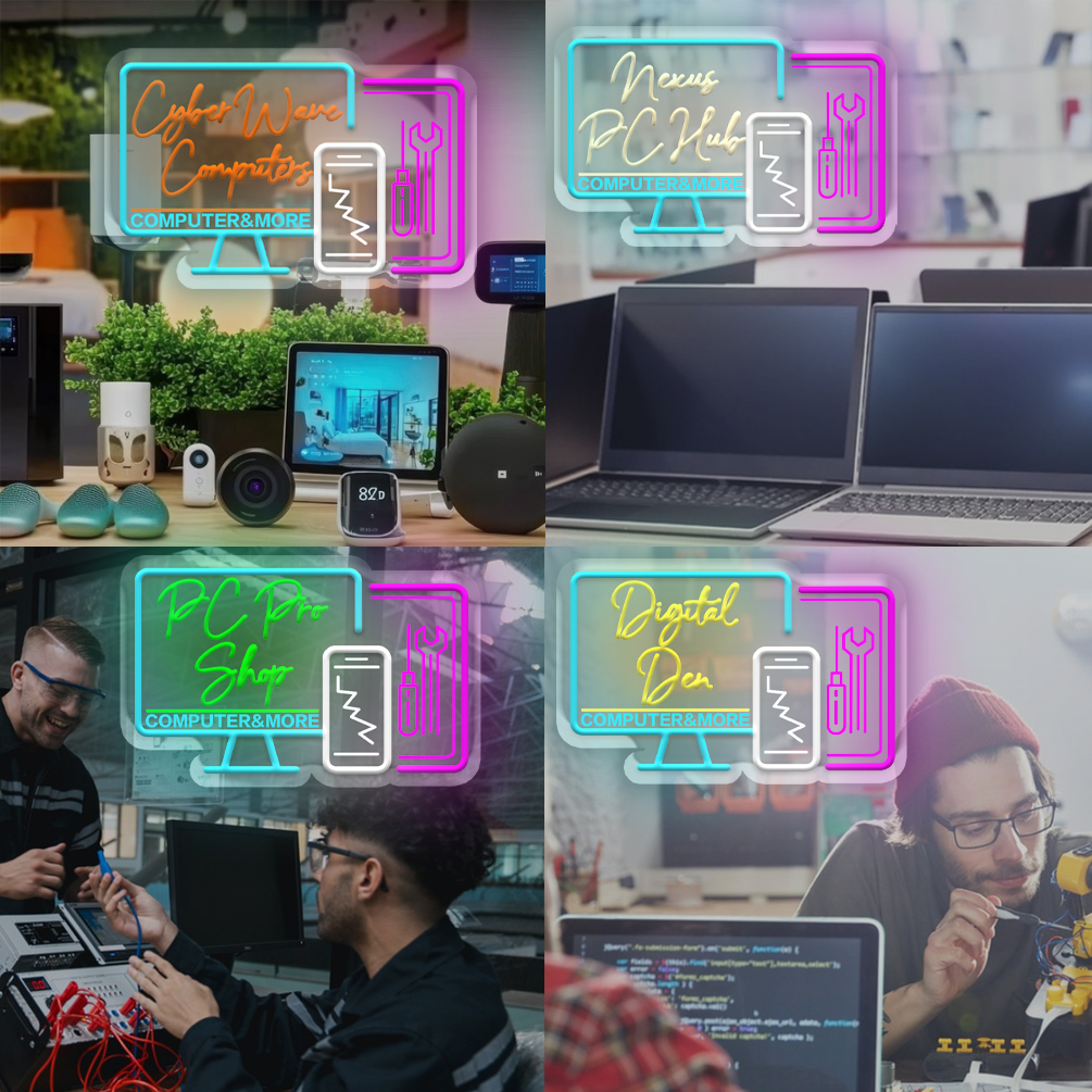 Customised neon signs for mobile phone and computer repair shops, featuring personalised LED neon lettering. Ideal for mobile phone, tablet and laptop repair services, home décor, and as the perfect gift for mobile repair shops or housewarming celebrations!