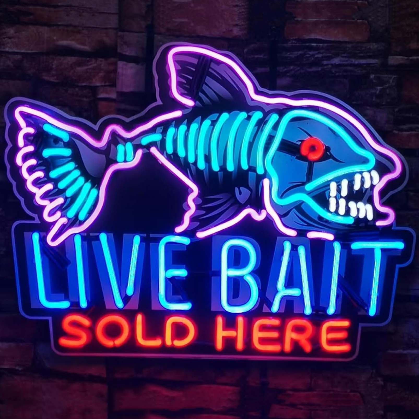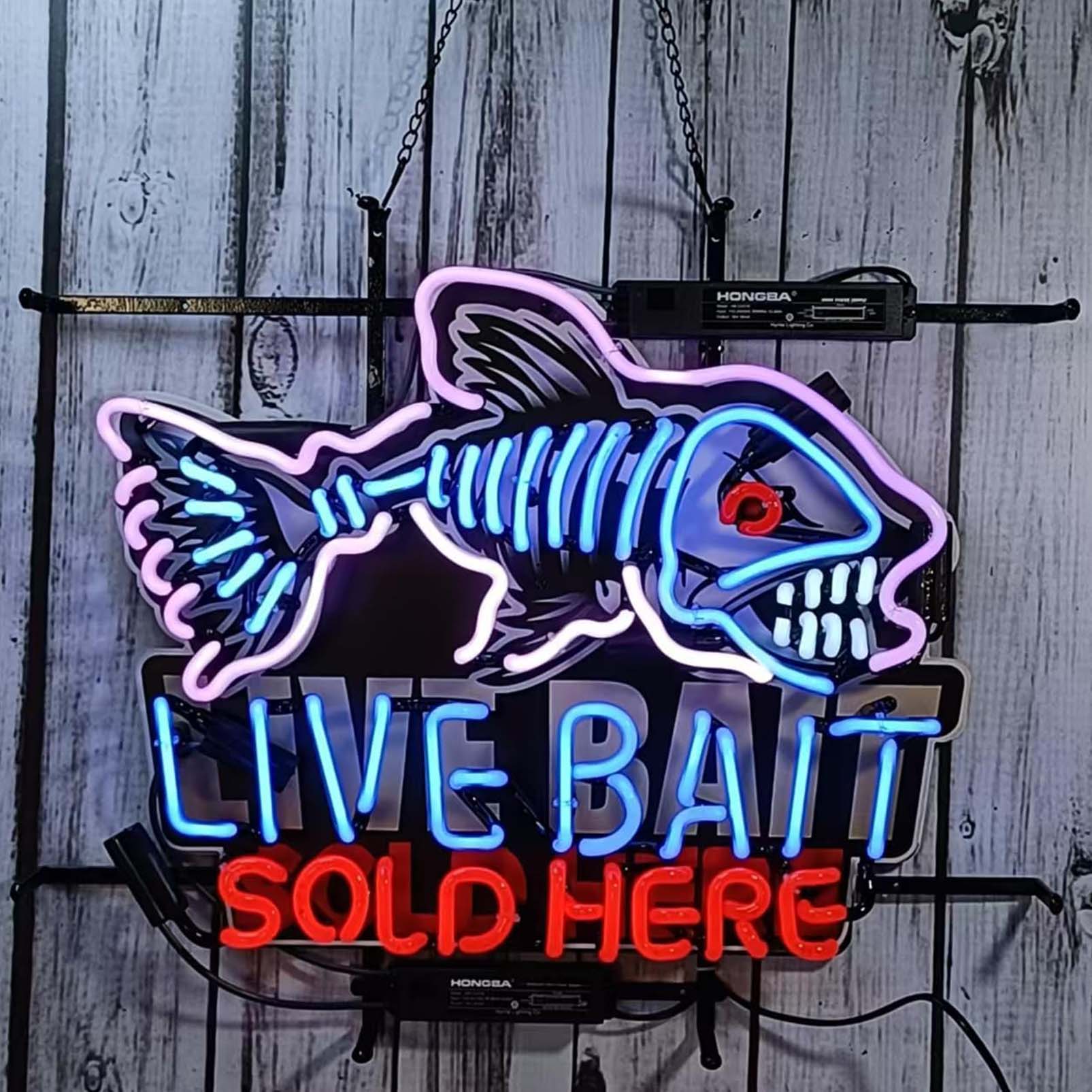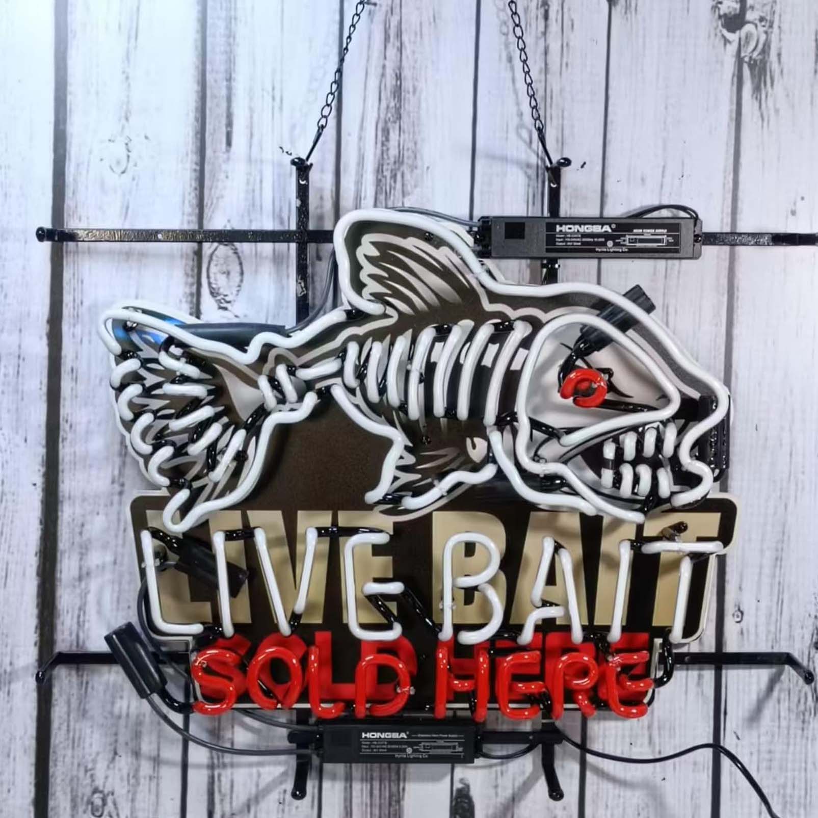 High quality super bright fishing live bait for sale sign with high definition inkjet graphic printing board, large glowing glass tube neon LED sign for office, party, coffee shop, bar, birthday, men’s cave, home and event wall art decoration.