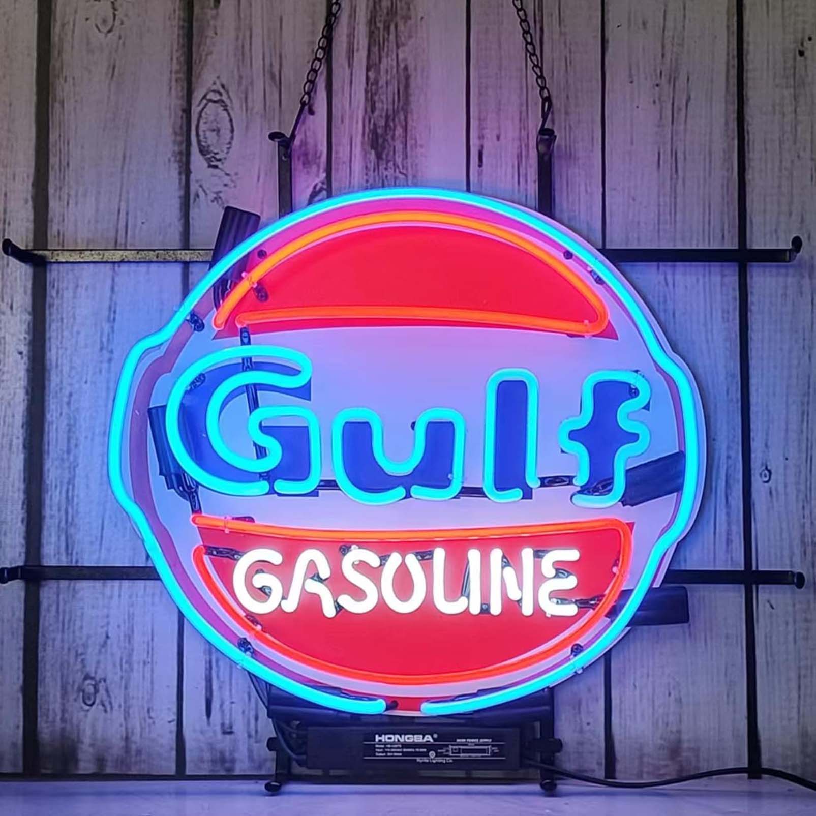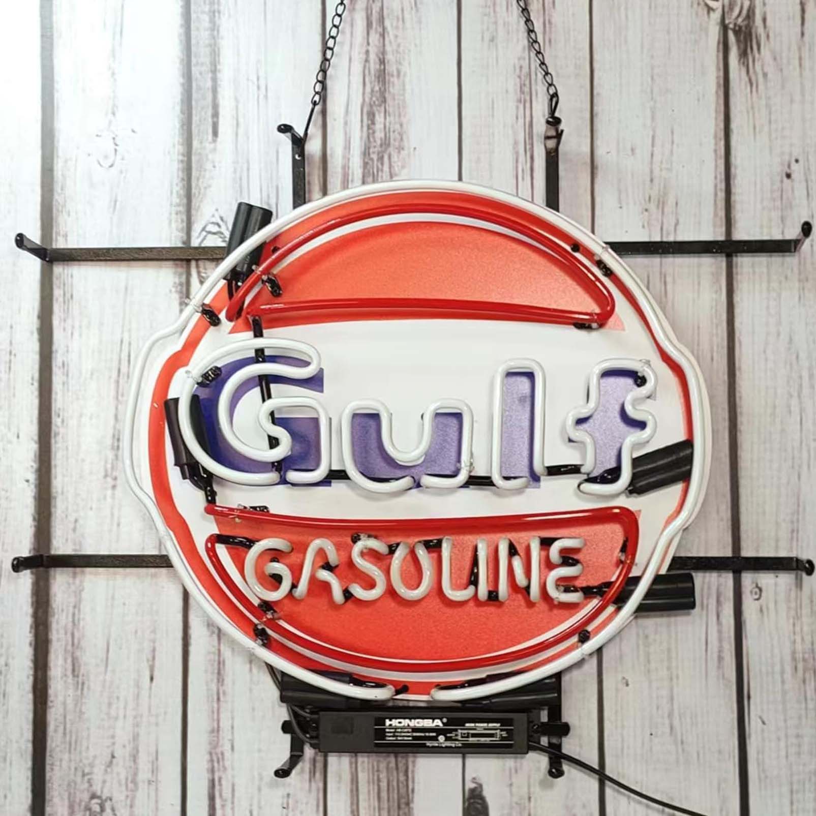 High quality super bright Gulf petrol sign, high definition inkjet graphic printing board, large glowing glass tube neon LED sign for office, party, coffee shop, bar, birthday, man cave, home and event wall art decoration.