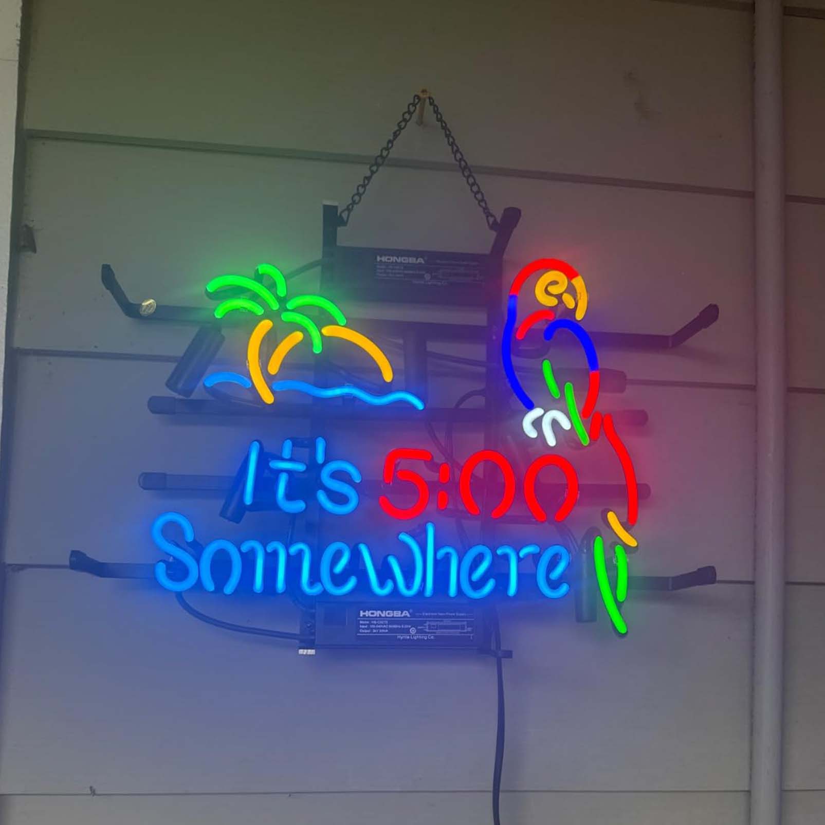 High quality super bright it’s 5:00 somewhere parrot palm tree sign, large glowing glass tube neon LED sign for office, parties, coffee shops, bars, birthdays, men’s caves, home and event wall art decor.