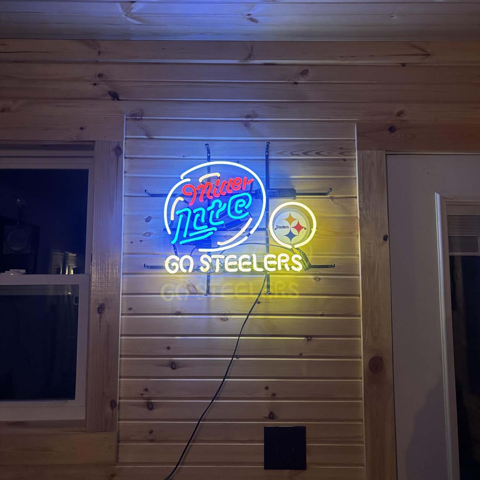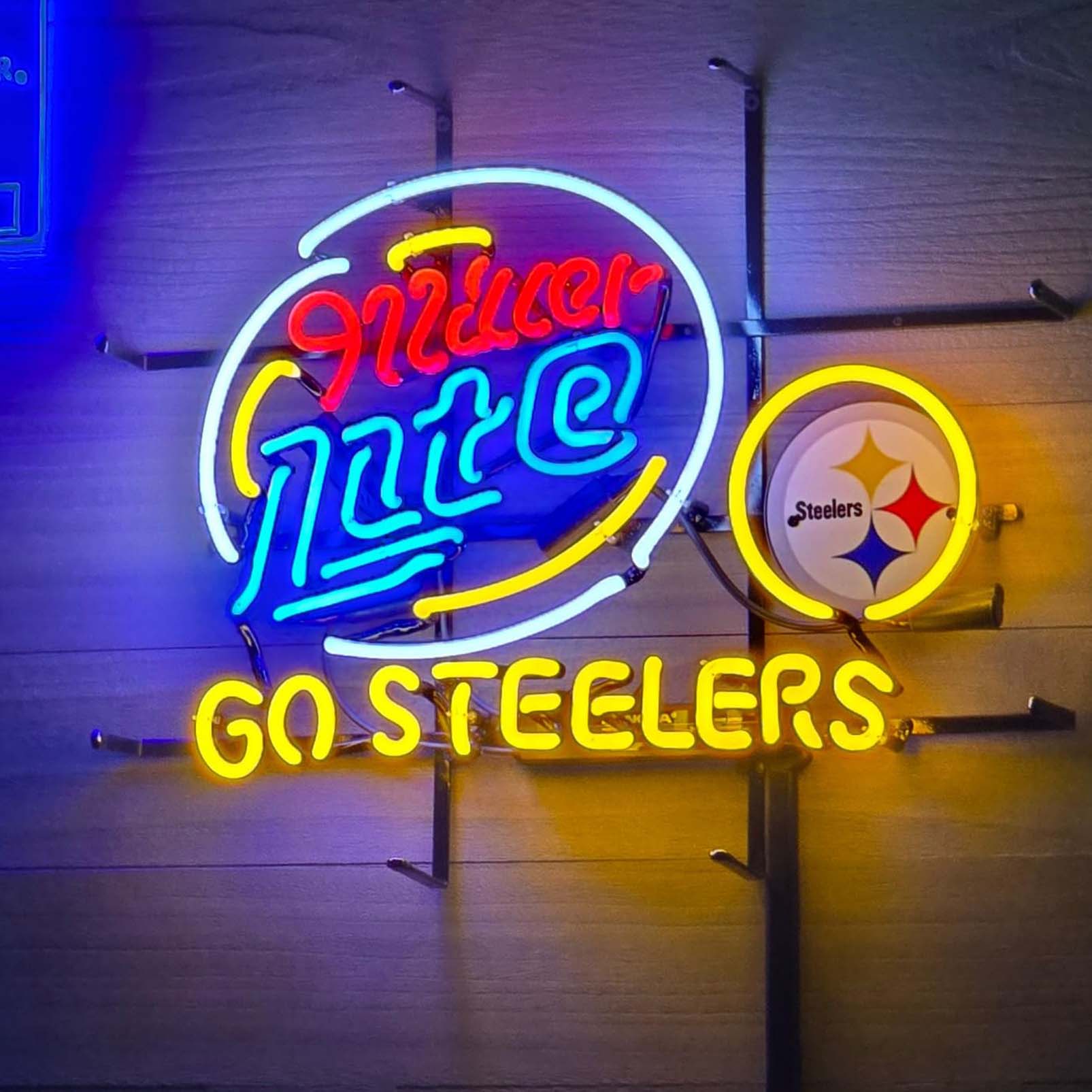 High quality super bright Miller Lite Go Steeler sign with HD inkjet graphic print board, large glowing glass tube neon LED sign for office, party, coffee shop, bar, birthday, man cave, home and event wall art decoration.