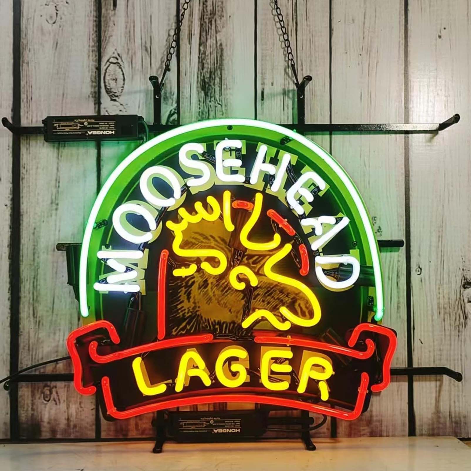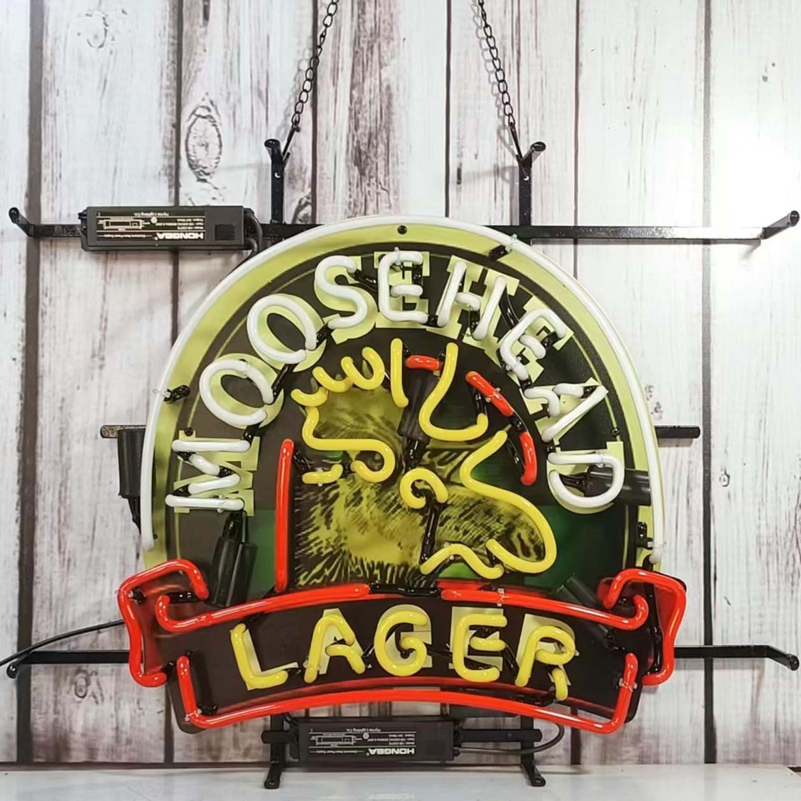 High quality super bright Moosehead Rag Maine moose sign with high definition inkjet graphic print board, large glowing glass tubes neon LED sign for office, parties, coffee shops, bars, birthdays, men’s caves, home and event wall art decor.