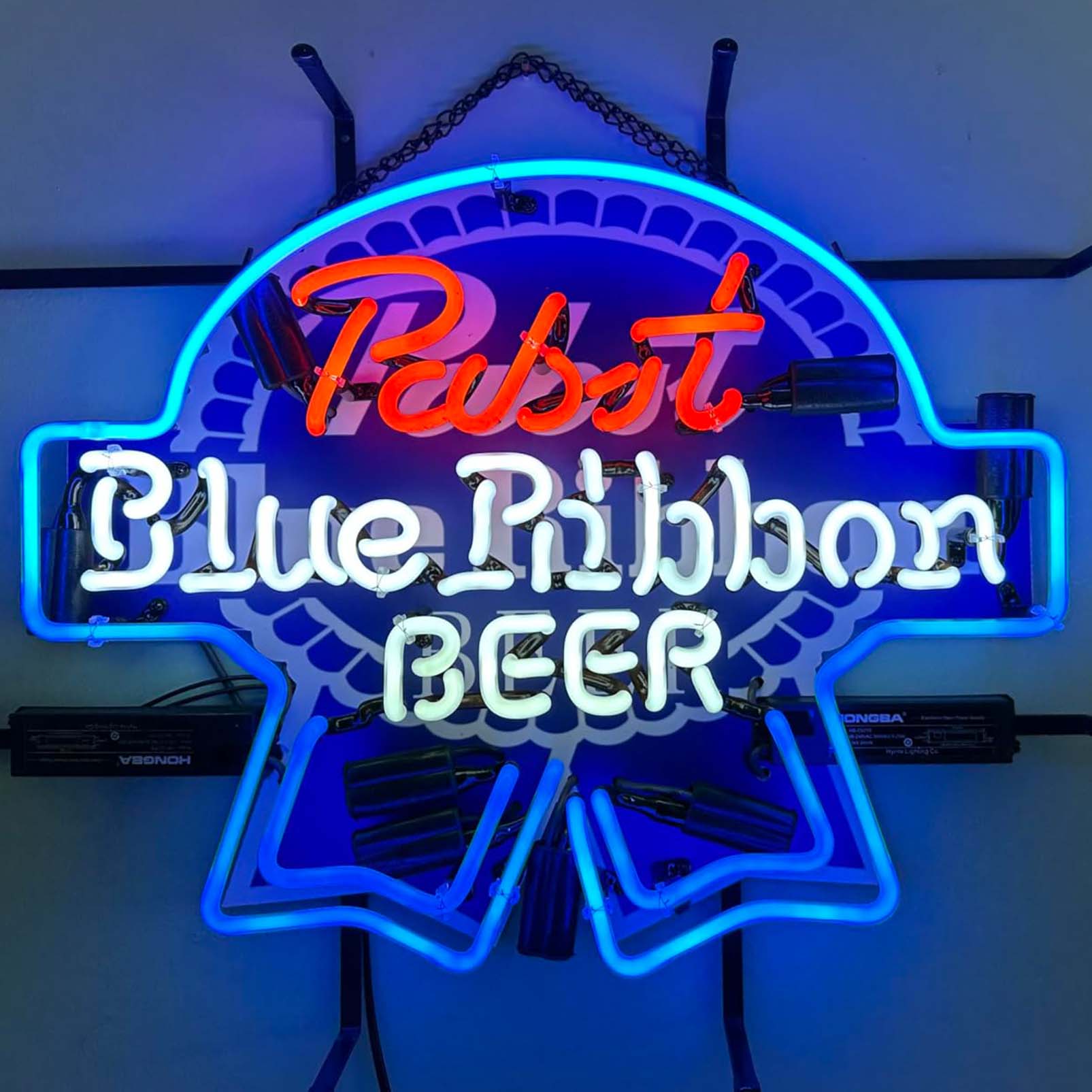 High Quality Super Bright Pabst Blue Ribbon Beer Bar Sign, HD Inkjet Graphic Printed Board, Large Glowing Glass Tube Neon LED Sign for Office, Party, Coffee Shop, Bar, Birthday, Men’s Cave, Home and Event Wall Art Decoration.