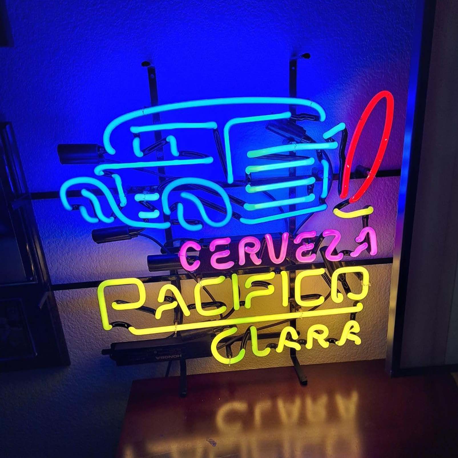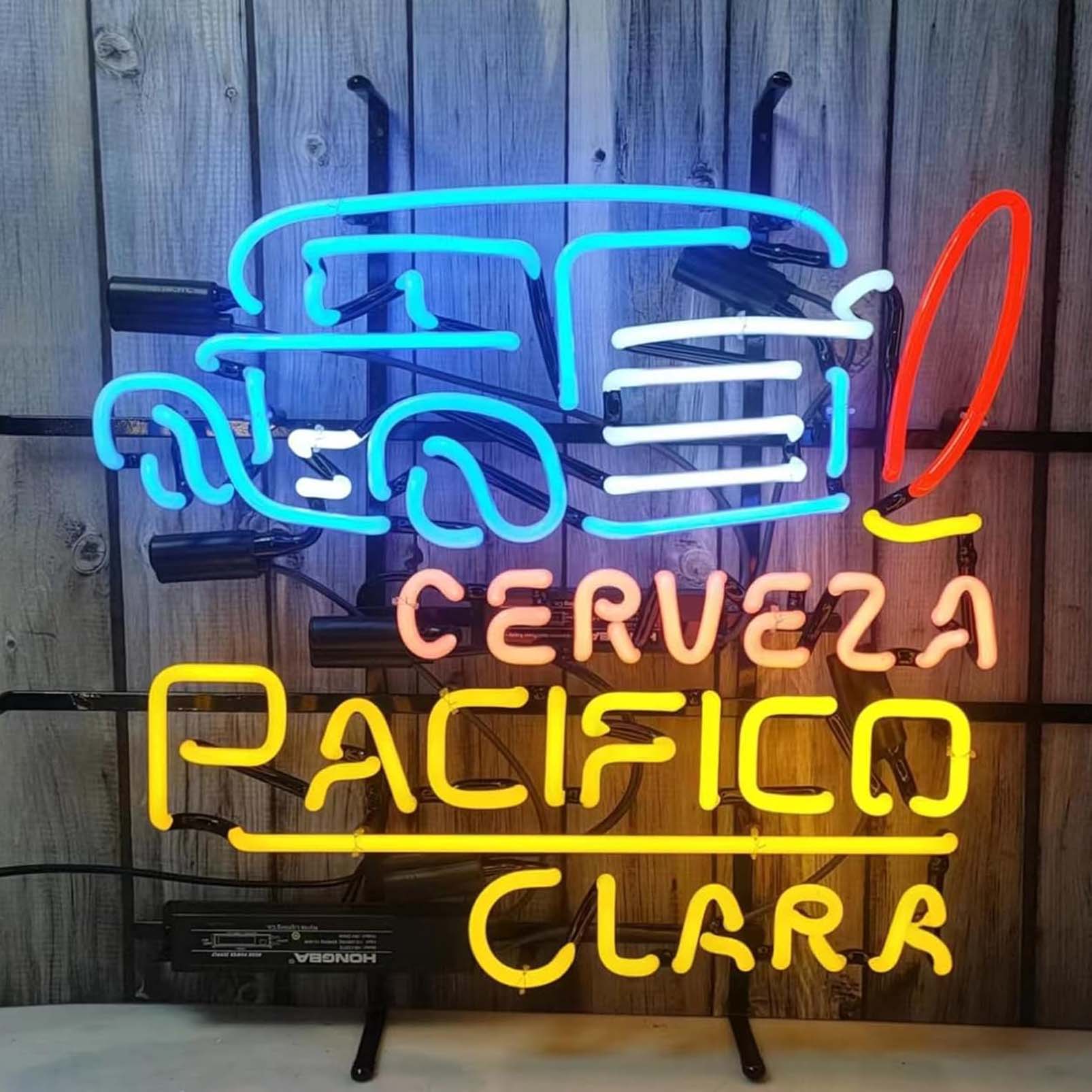 High quality super bright Pacifico Clara Cerveza Woodie Wagon sign, large glowing glass tube neon LED sign for office, party, coffee shop, bar, birthday, man cave, home and event wall art decoration.