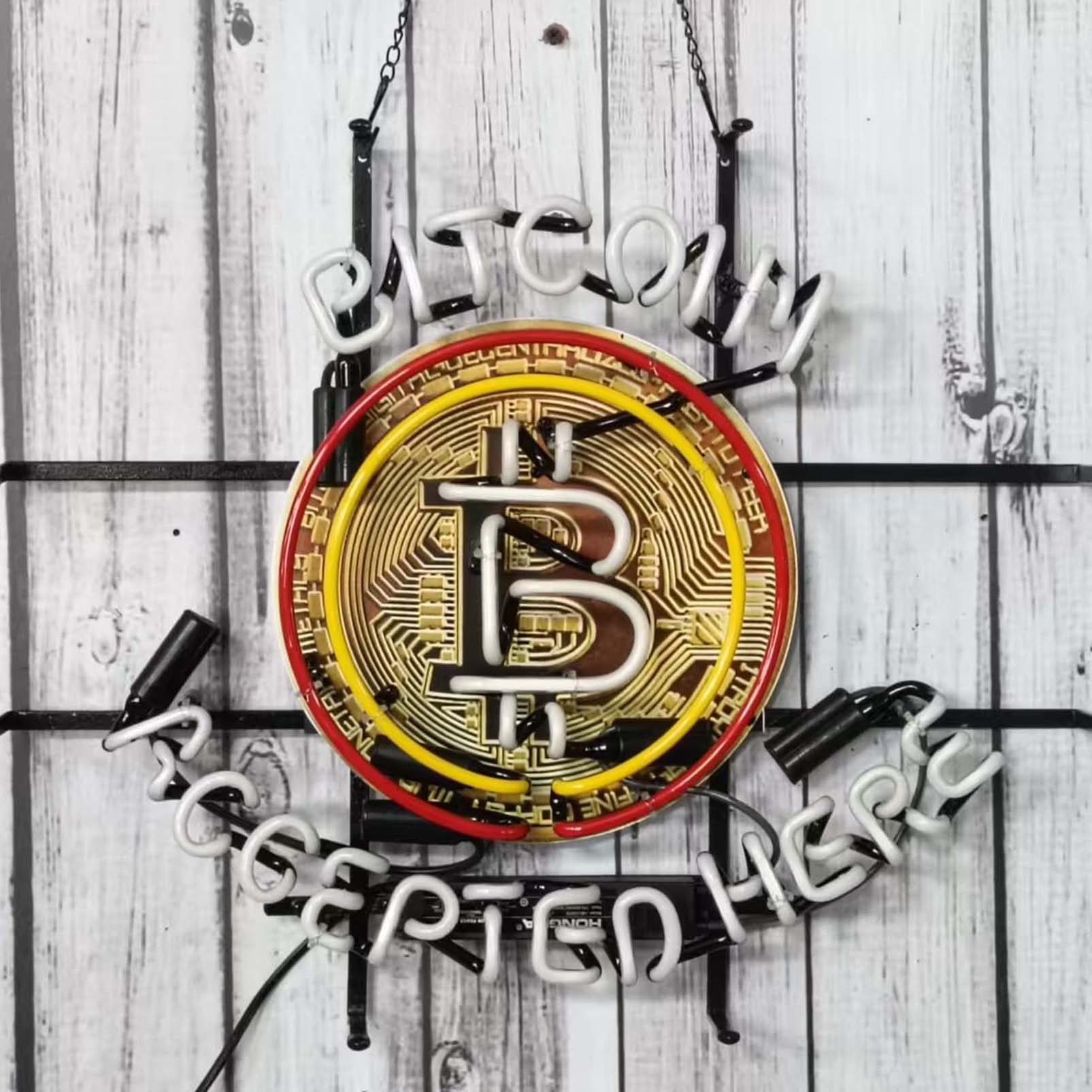 High quality super bright bitcoin sign with HD inkjet graphic printing board, large glowing glass tube neon LED sign for office, party, coffee shop, bar, birthday, man cave, home and event wall art decoration.
