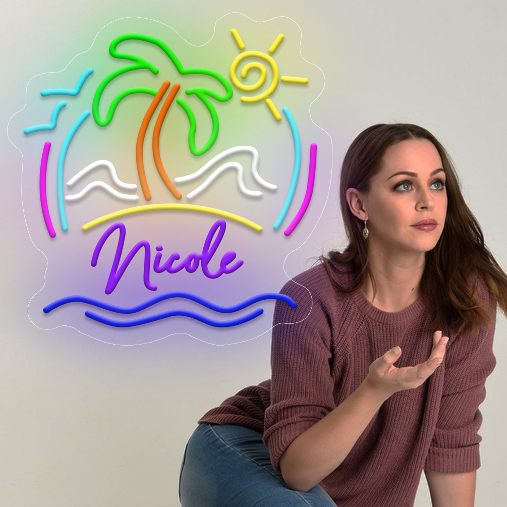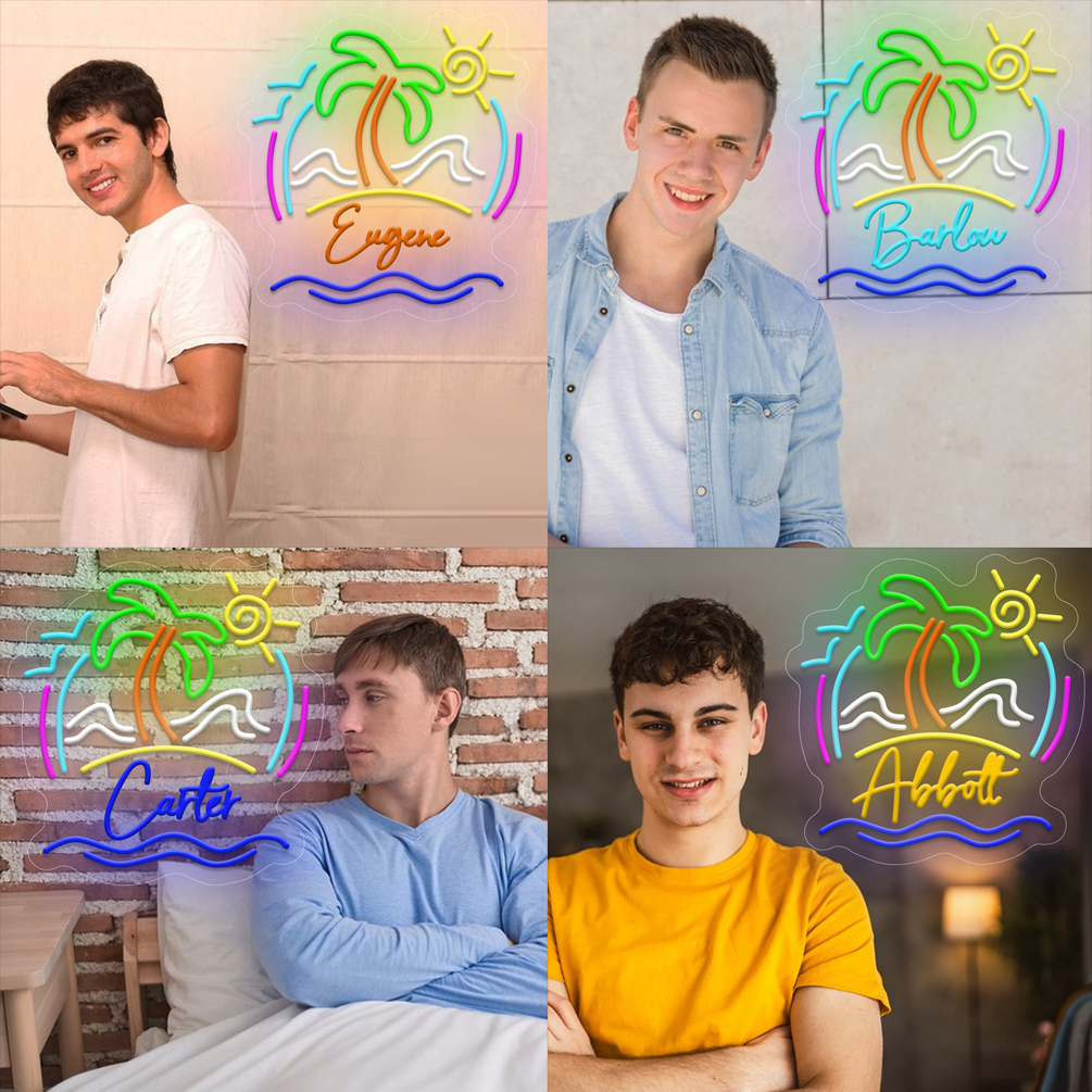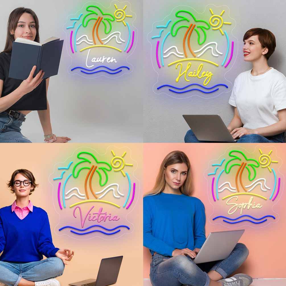Super Bright Coconut Tree with Beach Scene Customised Name Neon Sign, Personalised LED Neon Lights, suitable for party, bar, cold drink milk tea shop decorations, unique and ideal gift for birthdays, weddings children’s day, housewarming etc.
