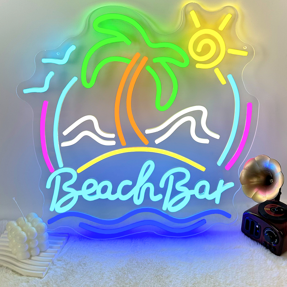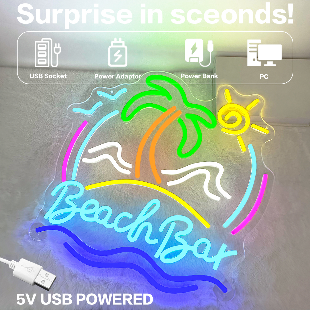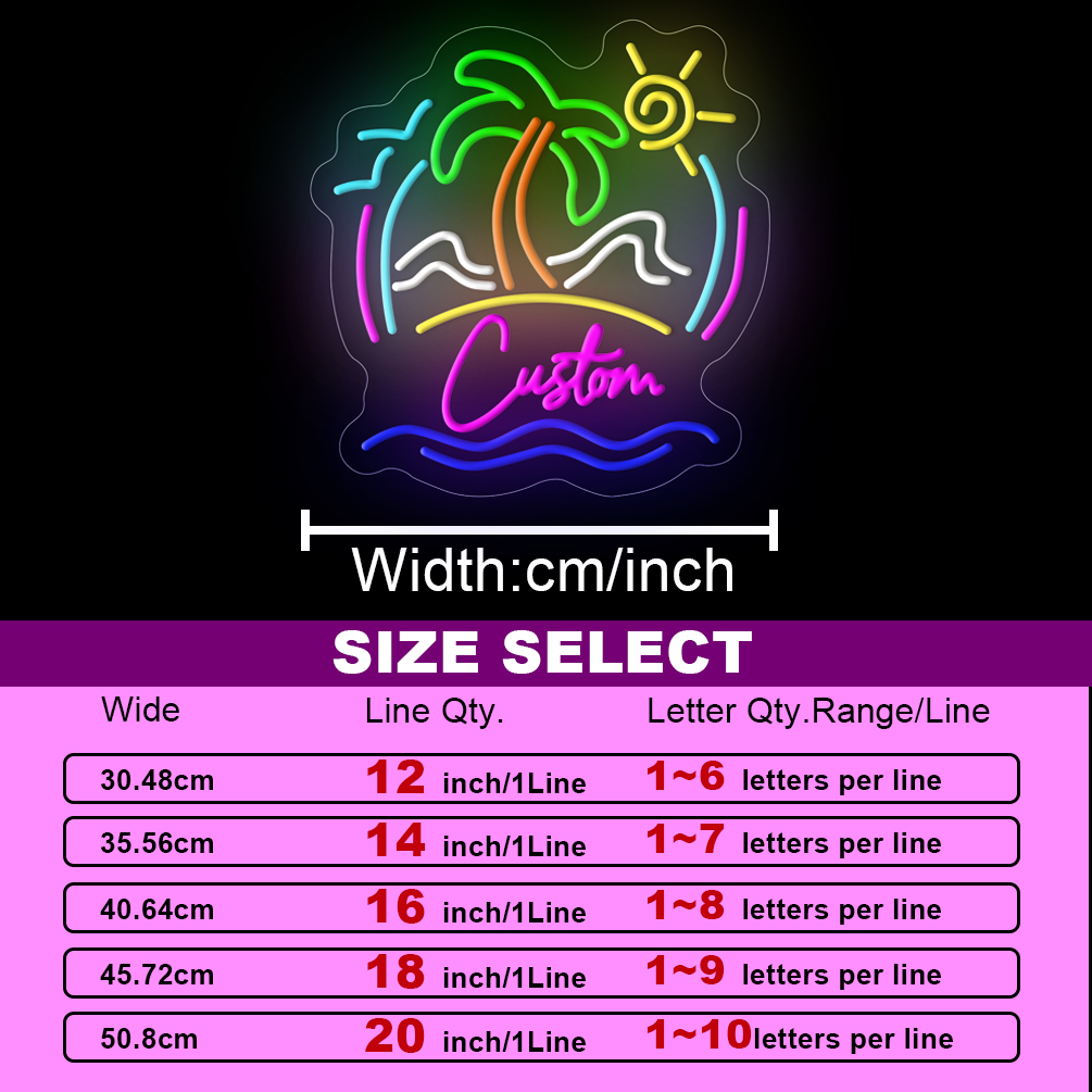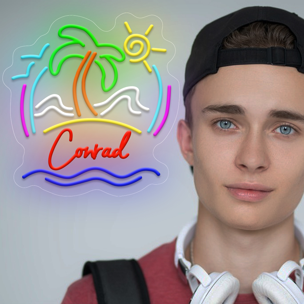 Super Bright Coconut Tree with Beach Scene Customised Name Neon Sign, Personalised LED Neon Lights, suitable for party, bar, cold drink milk tea shop decorations, unique and ideal gift for birthdays, weddings children’s day, housewarming etc.